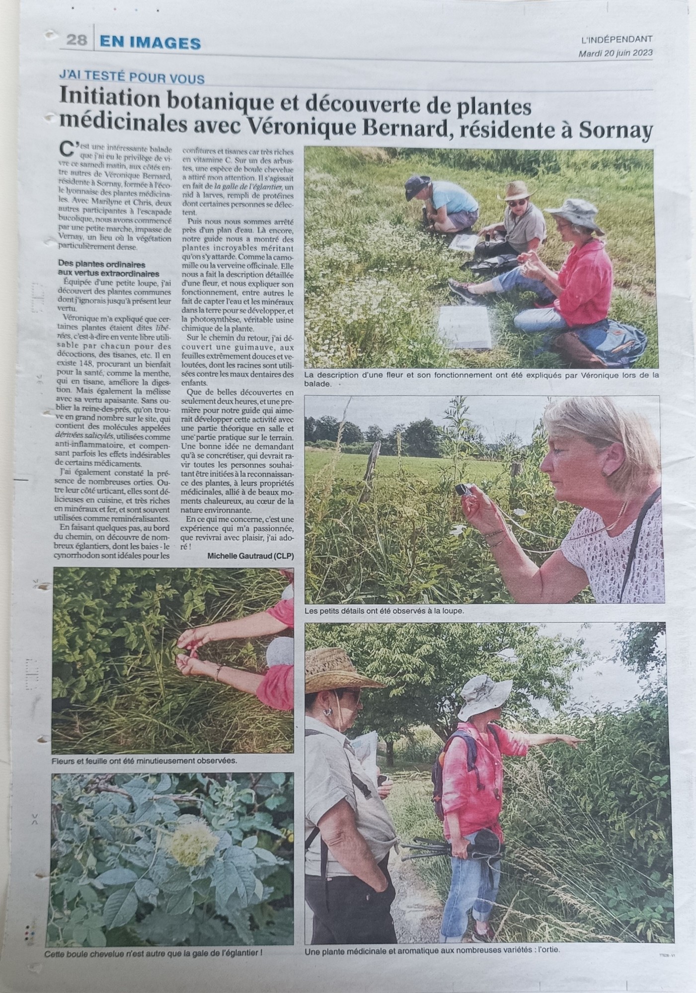 Je vous propose de déambuler sur les sentiers alentours à la découverte de la nature environnante. En chemin, nous découvrirons comment reconnaître quelques familles de plantes, je vous conterai les relations Plantes/Humanité, vous vous étonnerez de l'incroyable créativité du monde végétal. Au menu : une pincée de chimie, quelques grammes de termes latins, une bonne dose d'émerveillement et la promesse d'un regard neuf et enthousiaste sur Dame Nature. A consommer sans modération !