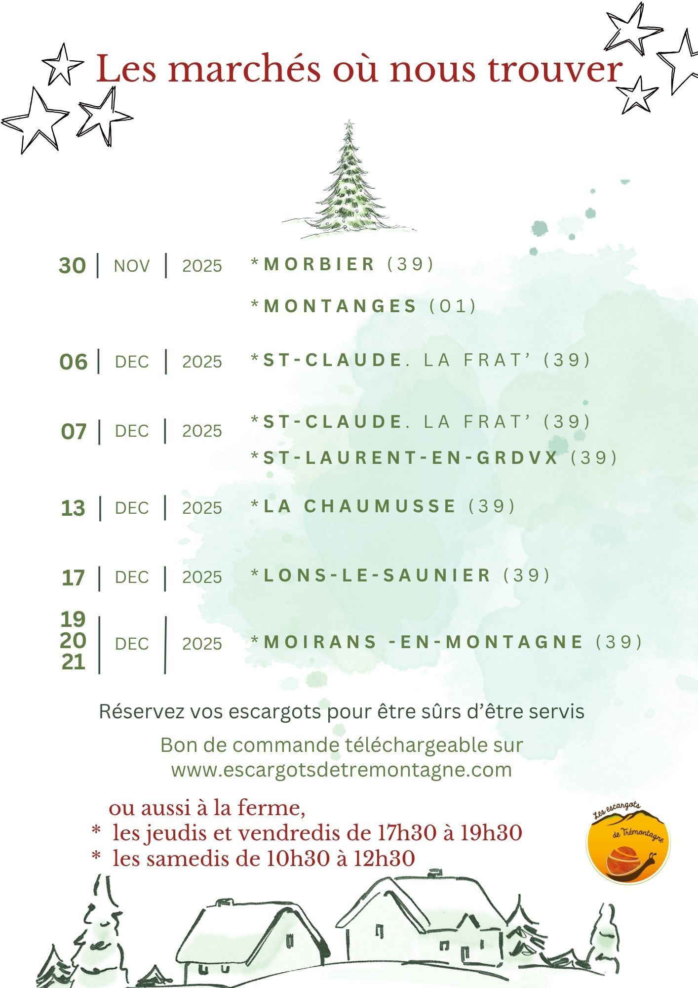 Au menu : Coquilles à la Bourguignonne, Croustilles au comté, à la Bourguignonne ou à la Provençale, escargots au court bouillon, Escargotines provençales et bourguignonne.