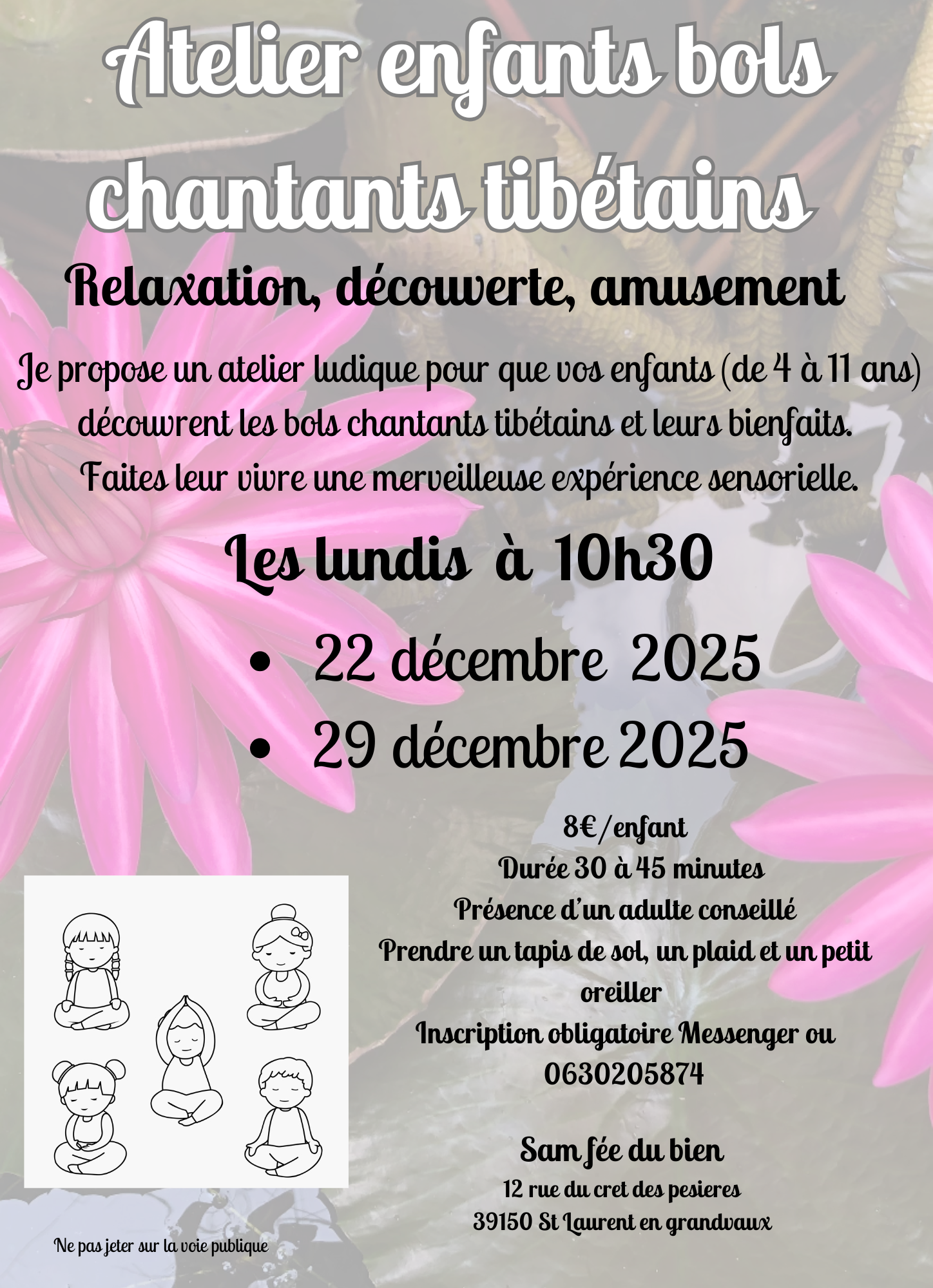 L'activité se pratique sur réservation uniquement. Prévoir un tapis de sol, un plaid et un oreiller.
