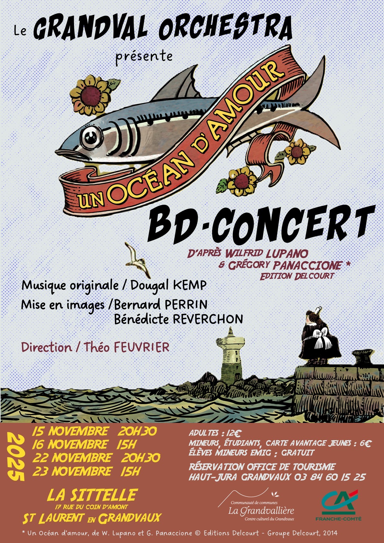 Un BD-Concert inédit : "Un Océan d'Amour" avec le Grandval Orchestra. Le Grandval Orchestra se lance dans une expérience artistique unique : un BD-Concert, où images et musique se rencontrent pour raconter une histoire pleine d’humour, de tendresse et d’aventure.