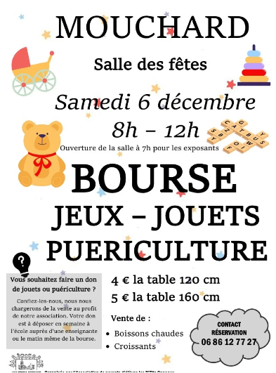 Venez faire un tour à la bourse aux jeux, jouets et puériculture à la salle des fêtes de Mouchard le samedi 6 décembre de 8h à 12h. Organisée par l'association de parents d'élèves de l'école de Mouchard "Les P'tits Copeaux".