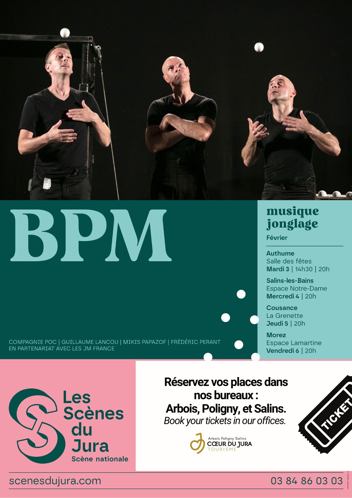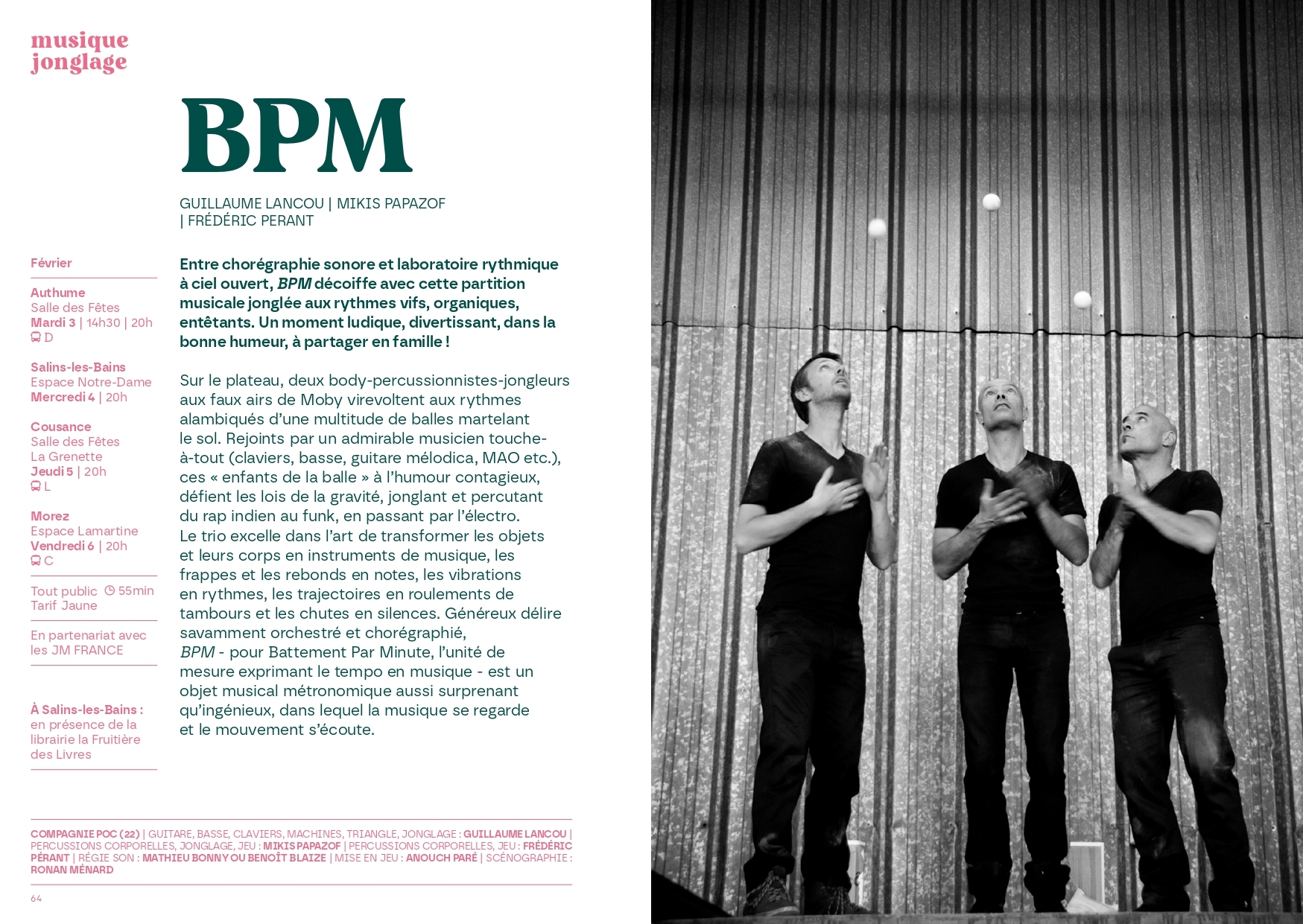 en rythmes, les trajectoires en roulements de tambours et les chutes en silences. Généreux délire savamment orchestré et chorégraphié, BPM - pour Battement Par Minute, l’unité de mesure exprimant le tempo en