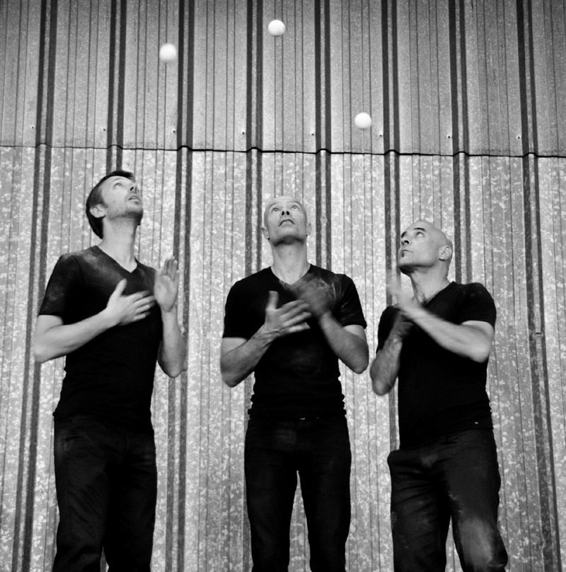 Le trio excelle dans l’art de transformer les objets et leurs corps en instruments de musique, les frappes et les rebonds en notes, les vibrations