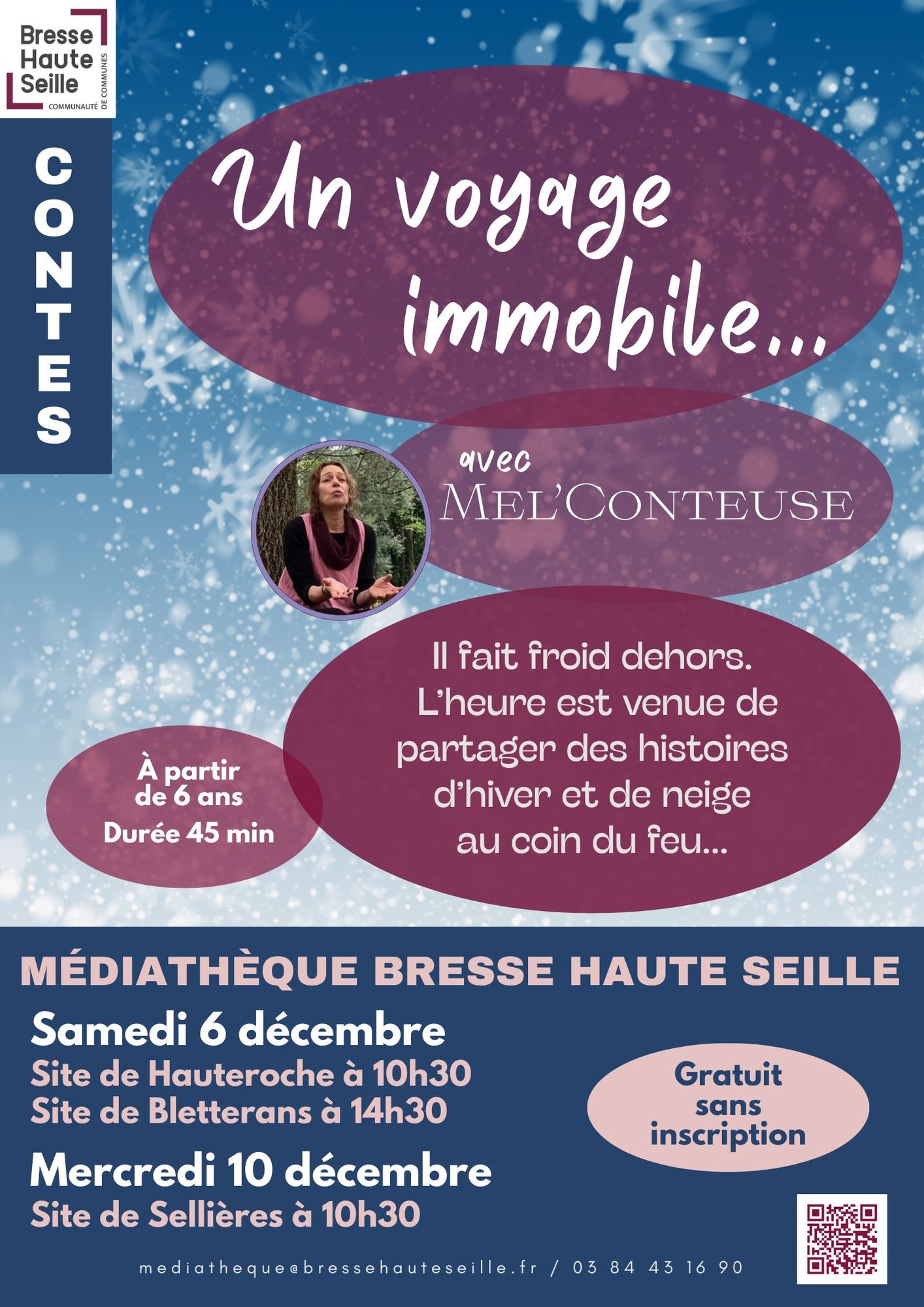 Voyage immobile Avec Mel'Conteuse. Il fait froid dehors. L'heure est venue de partager des histoires d'hiver et de neige au coin du feu sorties du panier au son des mélodies de Noël. Durée 45 minutes.