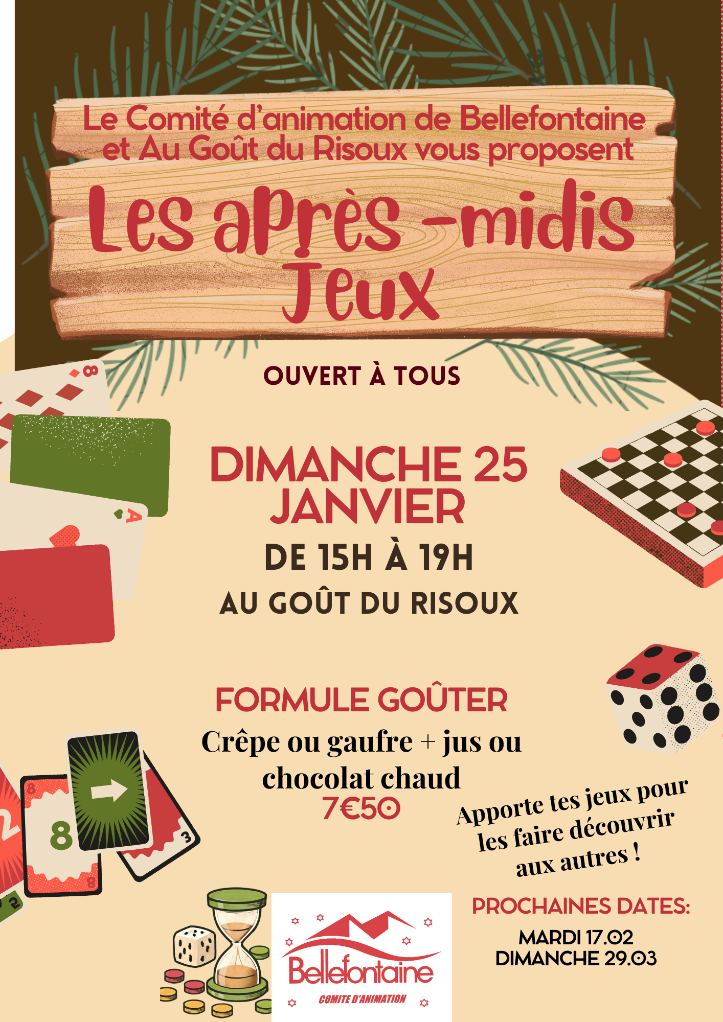 Le Comité d'Animation de Bellefontaine et le restaurant "Au goût du Risoux" s'associent pour vous proposer des après-midi jeux !