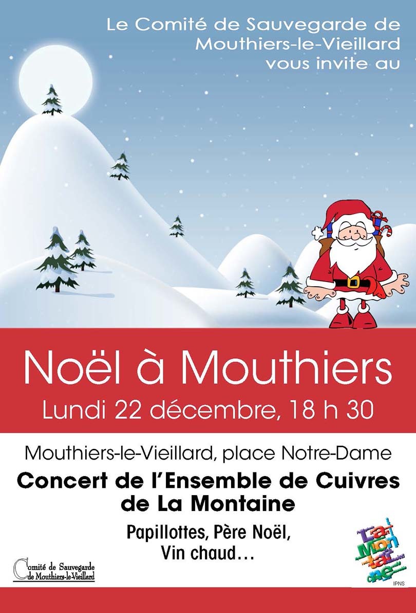 Le comité de sauvegarde de Mouthiers-le-Vieillard et La Montaine organisent le "Noël à Mouthiers". Concert de l'ensemble de cuivres de La Montaine, Papillottes, Père Noël, Vin Chaud...