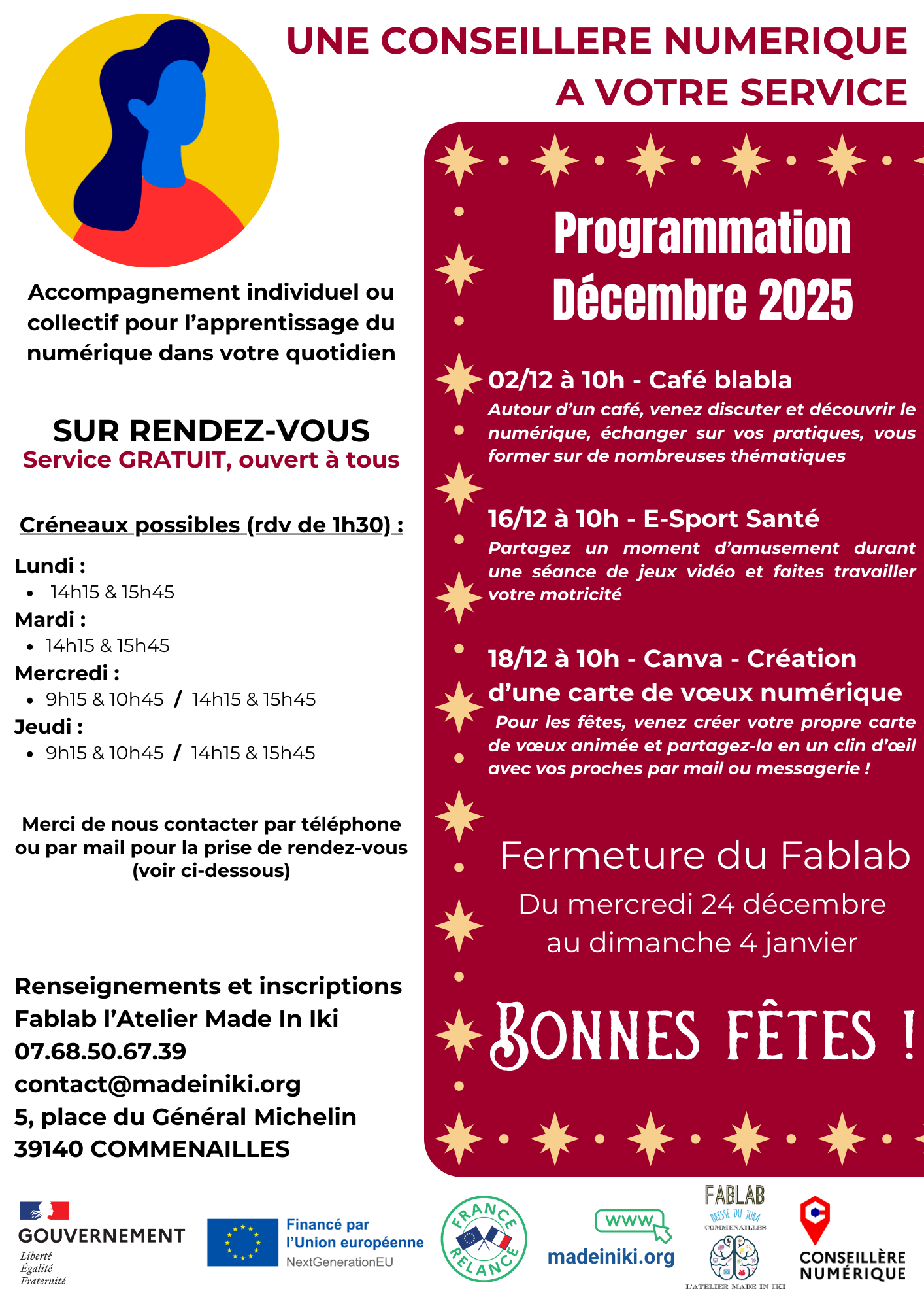 La programmation des ateliers Conseiller Numérique prévus en décembre est disponible