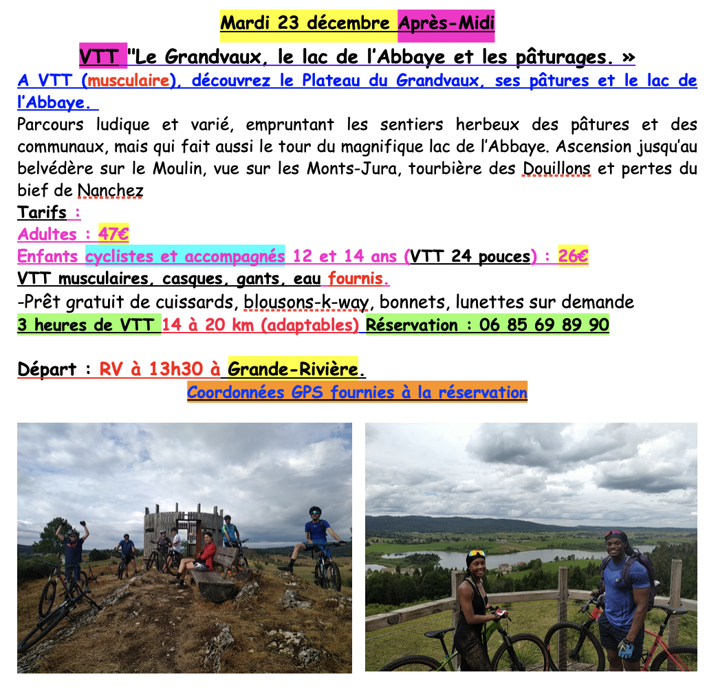 De 12 à 14 ans, accompagnés. VTT, casque, gants, eau fournis