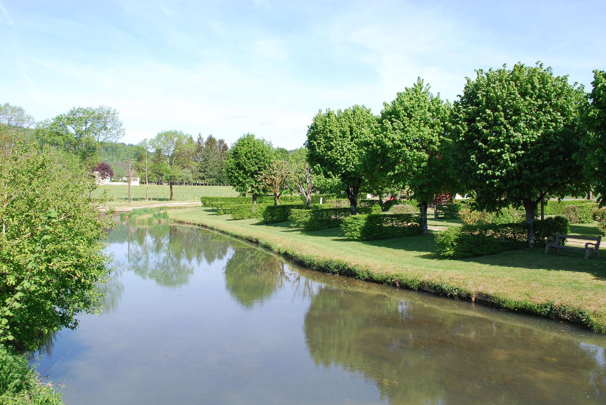 Aire de camping-cars située dans un cadre verdoyant en bord de rivière, équipée d’un point d’eau, d’électricité et d’une station de vidange.
