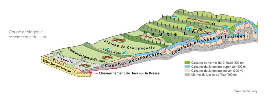 Le Jura est présenté comme une chaîne de montagnes, mais pour les géologues, il s’agit plutôt d’une fine pellicule de calcaire en mouvement… comme un coulis de fruits sur une panna cotta ! Effectivement, quand le plissement alpin a poussé et s’est soulevé il y a 11 millions d’années, tout ce qui se trouvait à son Ouest s’est lui aussi soulevé et a glissé vers la Bresse et la Bourgogne. Une très légère pente de l’ordre de 0,5° à 1° a suffi… C’est d’ailleurs cette glissade qui explique la structure du Jura : de grands plateaux non déformés (ou presque), tel le plateau de Champagnole, et des zones très plissées-cassées ici et là (à Salins par exemple).