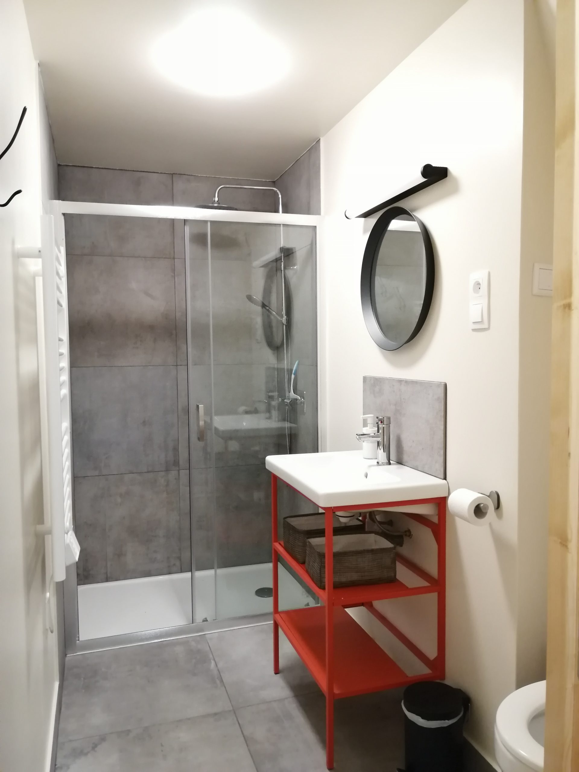 La salle de douche comprend les WC, un lavabo, une douche à l'italienne et un sèche serviette électrique.