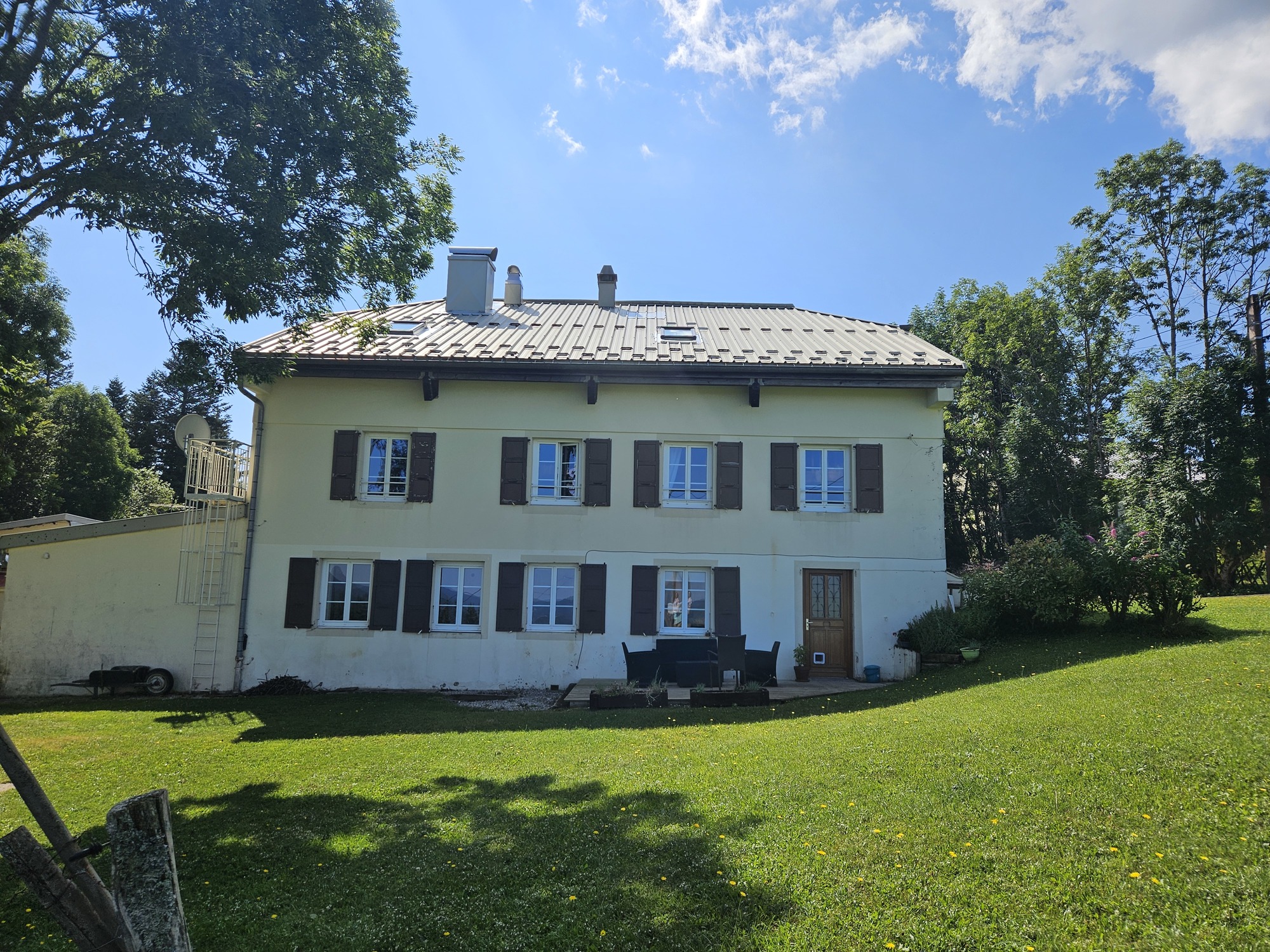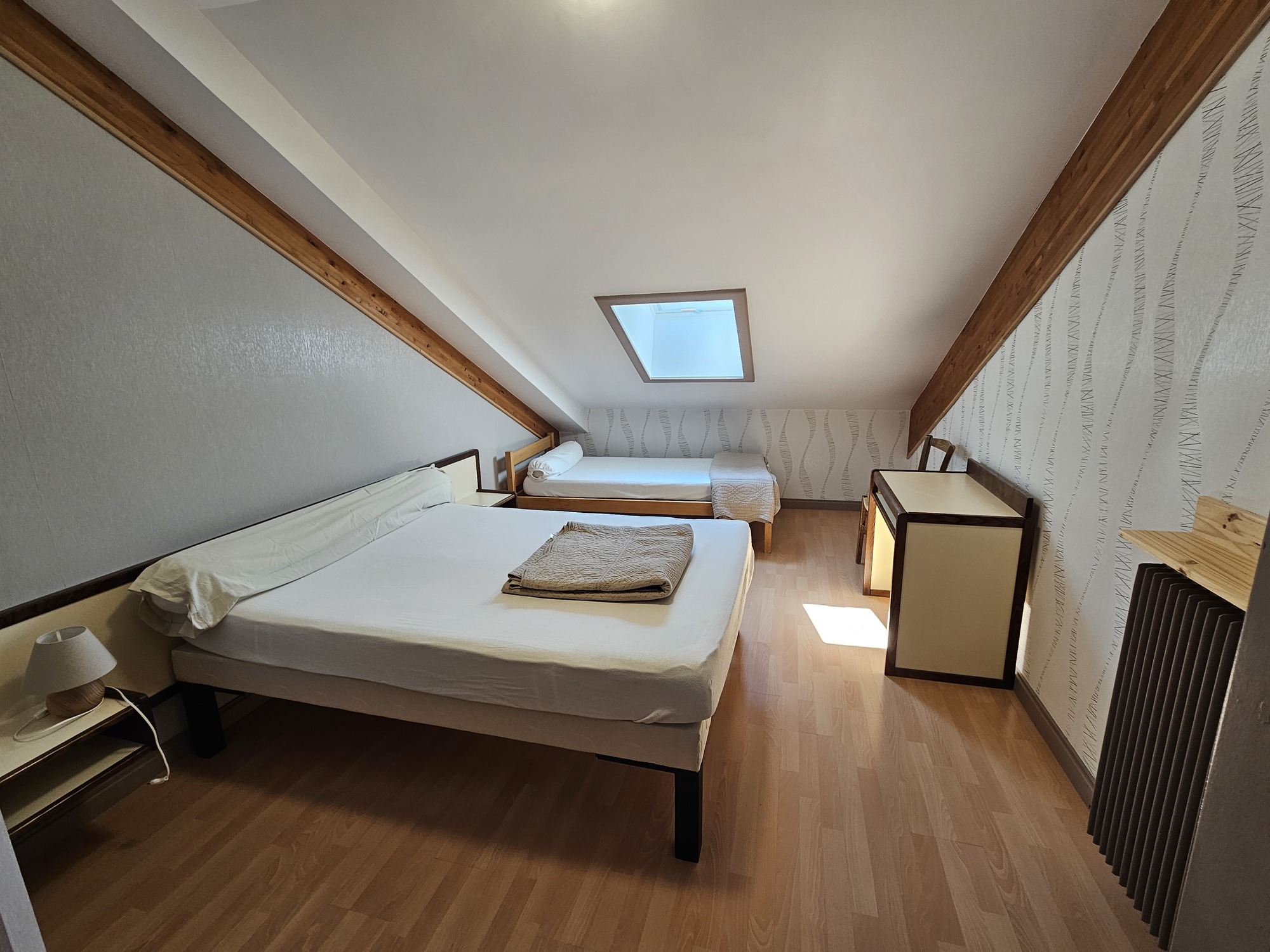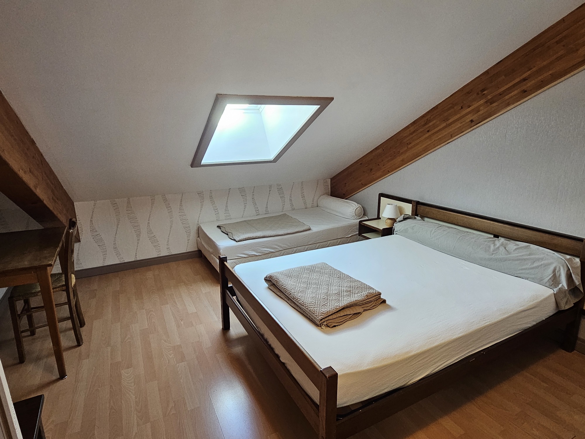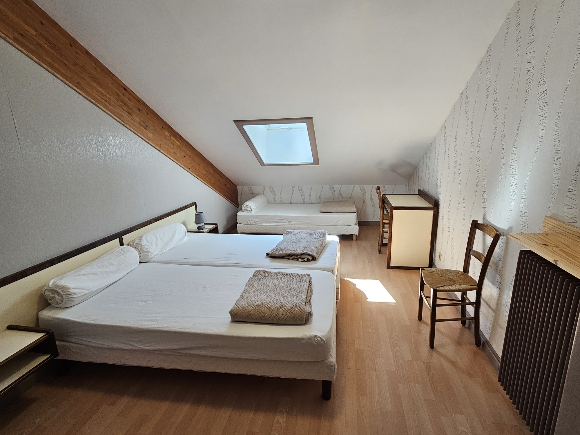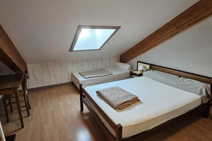 Situé dans une grande maison jurassienne, l’appartement de 84m² est composé d’un grand salon/salle à manger avec canapé convertible et coin cuisine/repas. A l’étage, vous trouverez 2 chambres avec lit de 140cm et lit 1 lit simple de 90cm. Une troisième chambre avec 3 lits simples de 90cm. Chacune des chambres possède sa propre salle d’eau. Deux toilettes se trouvent dans la maison, un à chaque étage. Un accès extérieur sur grand terrain non clos complète le tout.