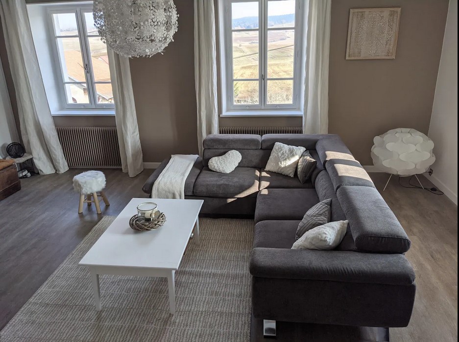 Situé dans le village de Saint Pierre dans le PNR du Haut Jura, grand appartement lumineux de 120m2, classé trois étoiles, situé au premier étage d'une maison de campagne individuelle, pouvant accueillir 6 personnes. Très jolie vue dégagée sur la campagne.