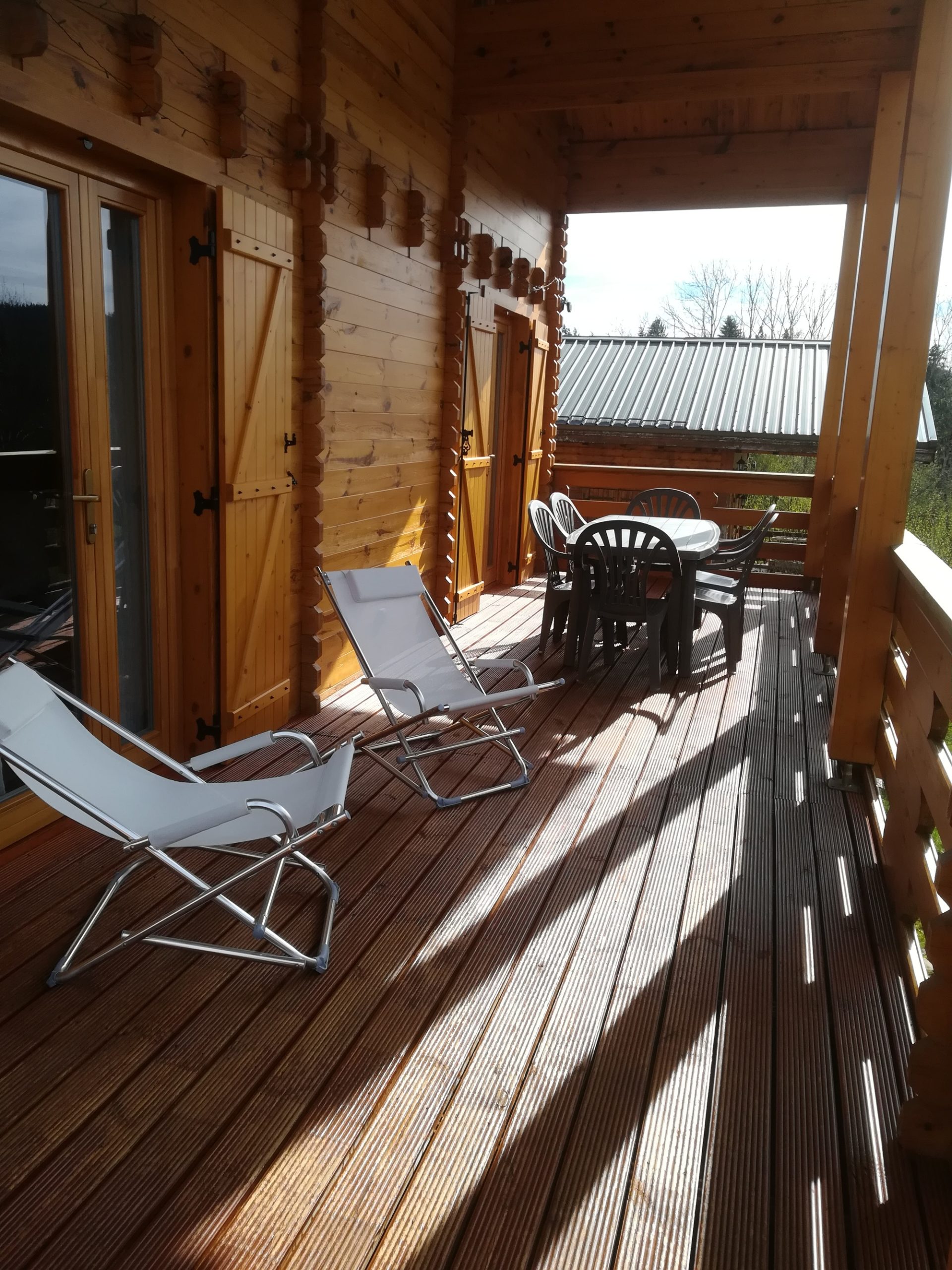 Le chalet est orienté plein sud avec un terrasse de 25m2, salon de jardin et transats.