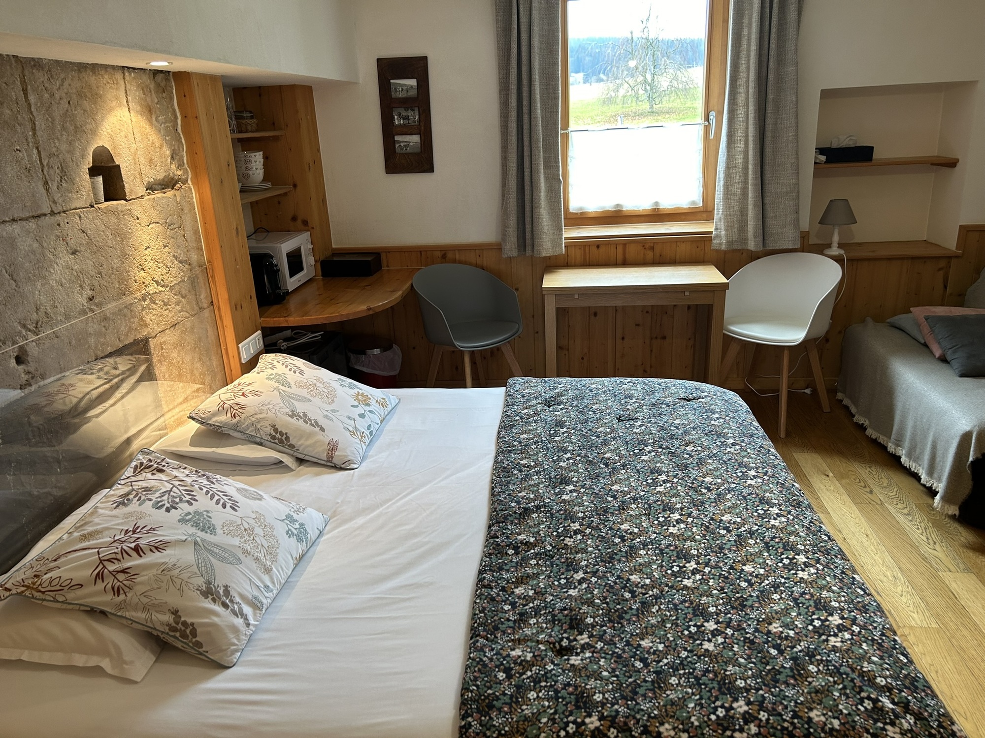 Situées au rez-de-chaussée d'une ancienne ferme du Haut-Jura, nous vous proposons des chambres spacieuses et confortables. Elles ont été rénovées avec goût, dans un style cosy et authentique.
