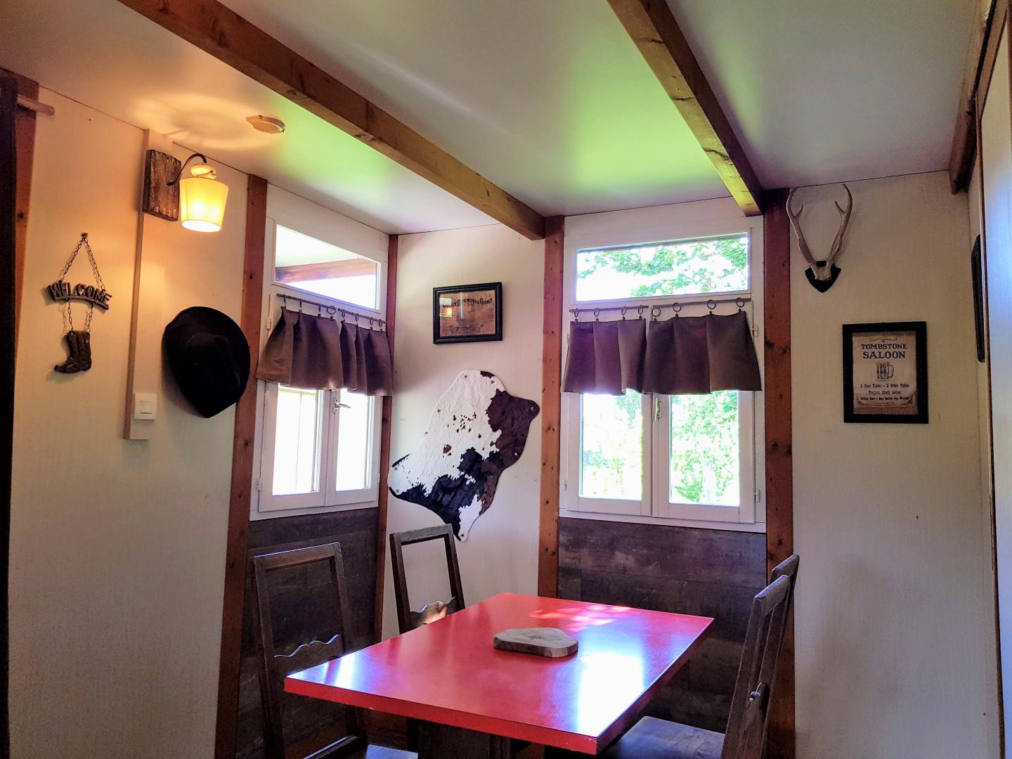 Situé au cœur d'un domaine équestre* de 12 hectares et dans un cadre naturel exceptionnel, ces hébergements type chalets vous accueillent dans un décor “western” insolite. A proximité évoluent les animaux de la ferme (chevaux, poneys, chèvres, lamas...), en toute quiétude et pour le bonheur des amoureux de la nature. Chaque chalet est composé d'une pièce à vivre avec kitchenette (plaque deux gaz, frigo table top, four micro onde, cafetière filtre, bouilloire et vaisselle nécessaire) et espace repas, une salle d'eau/wc, une 1ère chambre avec 1 lit de 140 et une 2ème chambre avec 3 lits de 80 dont 2 superposés (surface habitable : 21.70 m²), ainsi qu'une terrasse de 8.40 m². Au cours de votre séjour, vous aurez la possibilité de pratiquer diverses activités : randonnée à pieds, vélo, VTT... (départ depuis le gîte sur des pistes IGN), balades à poneys (activités proposées au sein de notre domaine dans le cadre de notre activité de "Ferme Équestre Élevage Juan"), piscine et thermes, lacs, visite de sites touristiques et culturels... ou tout simplement profiter de notre domaine pour vous reposer sur le temps d'un week-end ou durant quelques jours de vacances Notre domaine se situe entre monts et vallées, ce qui vous offre le loisir découvrir des sites nommés plus beaux villages de France (Château-Chalon, Baume-les-Messieurs), des villages pittoresques ( Poligny ville du Comté ; Arbois – son musée et ses vins ; Salins-les-Bains – ses thermes et fortifications ; Dole – la Venise Jurassienne ; Arc-et-Senans et ses salines classées au Patrimoine Mondial de l'UNESCO...), la région des lacs (Chalain,...) et des cascades (du Hérisson, des Tufs...) Animal de compagnie acceptés gratuitement et dans le respect de la charte d'accueil des animaux de "Gîte de France" (un par logement – possibilité d'accueil supplémentaire avec accord des propriétaires). Caution de 300 € par animal demandée. Pour charge de véhicule électrique un surcout sera demandé (voir avec la propriétaire)