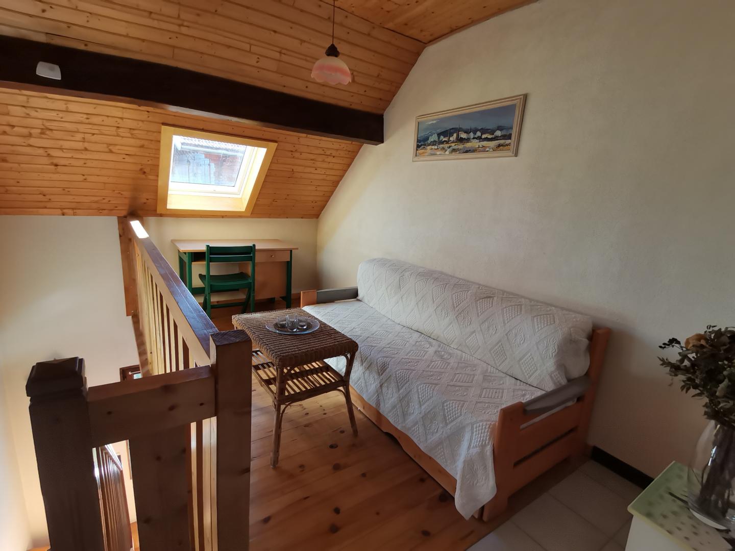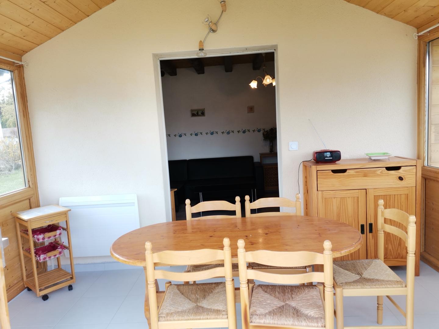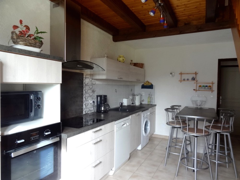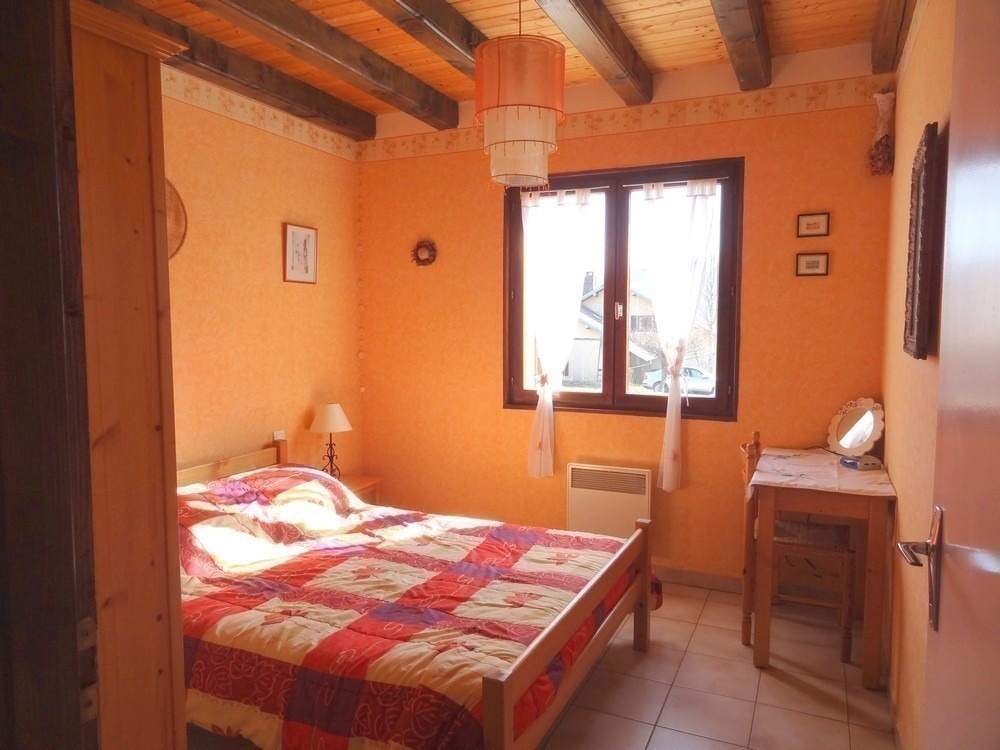 Maison indépendante située au coeur de la région des lacs et cascades, au pied et avec vue sur le lac d'Ilay. Intérieur bois avec véranda fermée avec coin cuisine, salon de jardin, barbecue. Garage pour rangement vélos et matériel divers (skis...),parking privatif. Grand jardin attenant avec aire de jeux. Au rez de chaussée: cuisine équipée ouverte sur salon-séjour, fourneau à vitre apparente, ch1: 1lit 2pl, salle de bain, WC indépendant. A l'étage: mezzanine avec coin salon, canapé convertible 1pers, ch2: 1lit 2pl, ch3: 1lit 1pl, WC indépendant, salle d'eau en option avec supplément de 30€/semaine. Chauffage bois et électrique (forfait bois variant de 25 à 45€ selon saison). Un seul chien accepté (pas de chat) avec une caution de 450 €
