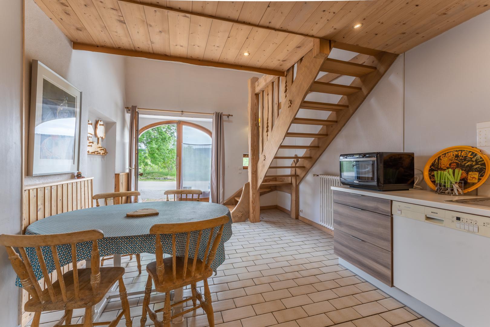 Dans un hameau paisible, au coeur du Parc Naturel Régional du Haut-Jura, Fabienne et Andrew vous accueillent dans leur gîte aménagé dans une ancienne ferme, située sur le plateau du Grandvaux, à Saint-Pierre : pour des vacances à la montagne comme vous les aimez en famille ou entre amis ! Depuis la maison, la vue sur les grands espaces du Grandvaux vous invite à la randonnée, le ski, les raquettes, le vélo … selon les saisons et selon vos envies ! Sans oublier le lac de l'Abbaye, à moins de 2 km, qui vous séduira été comme hiver : baignade ou patinage. Maison mitoyenne avec au rez de chaussée: cuisine-séjour (plaques à induction), chambre 1: 2 lits 1 place (90x200), salle d'eau avec WC. A l'étage: mezzanine avec salon, lecteur DVD, connexion internet. Chambre 2: 1 lit 2 places (160x200), WC indépendant. Chauffage électrique. et central. Cour et jardin non clos, salon de jardin, barbecue. Toutes charges comprises en été (sauf recharge de voiture électrique). A disposition: équipement bébé. Abri voiture. Vélos musculaires, selon disponibilités, précision sur demande. A St Laurent possibilité de louer des vélos électriques. offre fidélité : location de 2 semaines le linge de toilette est fourni gratuitement - location de 3 semaines linge de toilette et draps fournis gratuitement