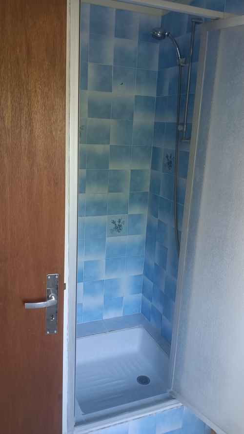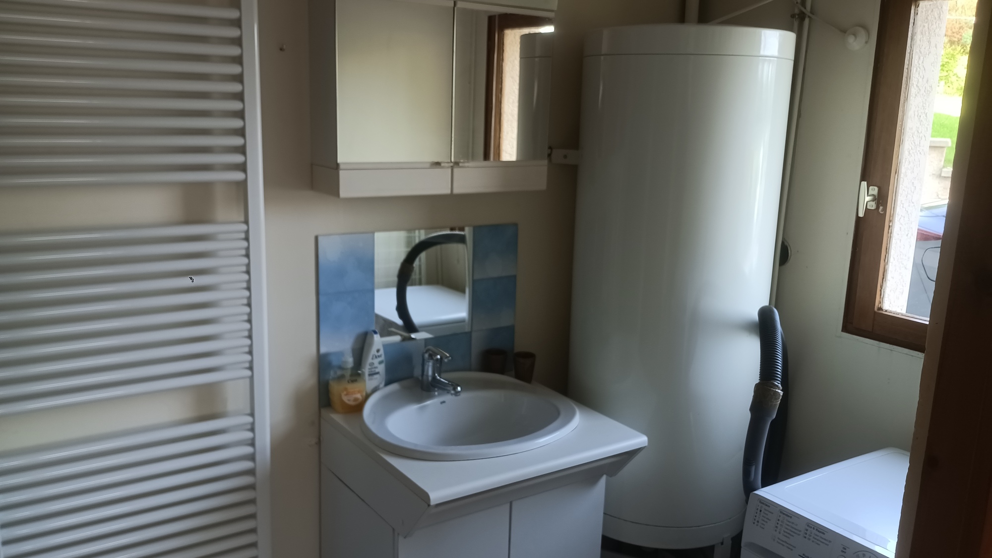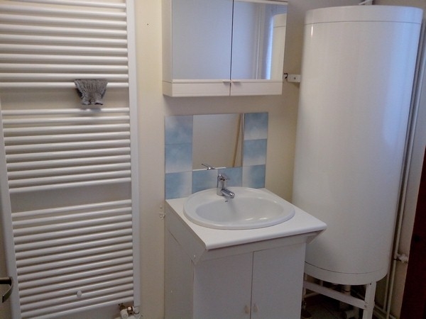 La salle de bains, pratique et bien équipée, comprend une douche, un lavabo, un sèche-cheveux ainsi qu’un lave-linge.