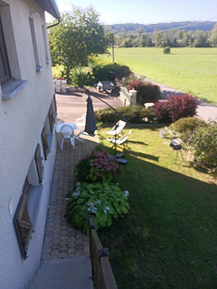 À l’extérieur, profitez d’un agréable espace pelouse avec salon de jardin, chaises longues, parasol et barbecue à gaz pour vos repas en plein air, avec une belle vue sur les paysages environnants.