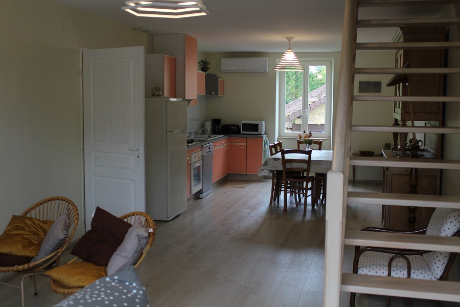 Au cœur du vignoble du Sud Revermont, à 14 km de Lons-le-Saunier, gite pour 4 personnes, rénové récemment et climatisé, dans une maison mitoyenne avec celle des propriétaires. Rez-de-chaussée surélevé, entrée par un balcon ou par la grange. Au rez-de-chaussée : grande pièce de vie avec un canapé convertible, télévision, cuisine équipée (petit électro-ménager, four, lave-vaisselle), salle d'eau avec douche, lavabo et machine à laver, fer à repasser, toilettes. A l'étage : une chambre avec un lit deux places (possibilité de lit bébé), une chambre avec deux lits une place, une salle d'eau avec douche et toilettes. Dépendances (grange, cave avec baby-foot et table de ping-pong, grenier avec étendage à linge). Côté extérieur, une terrasse vous permettra de profiter des beaux jours. Dans le village, deux vignerons vous accueilleront dans leur caveau de dégustation, visite de la Caborde, randonnée pédestre, VTT, voie verte (location de VTT, VTC, vélo électrique, remorque pour enfant, à Lons-le-Saunier), grottes, reculées, cascades et autres sites naturels, pêche, baignade (Vouglans, Clairvaux les lacs, Chalain, plan d'eau de Louvarel...), équitation, thermes, bowling, casino, cinéma, médiathèque à Lons-le-Saunier