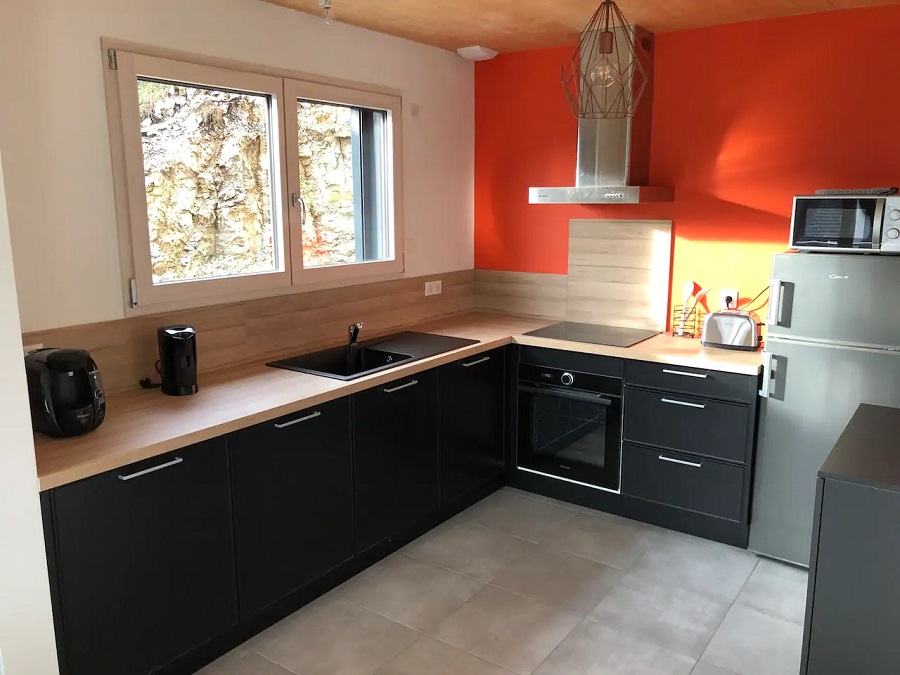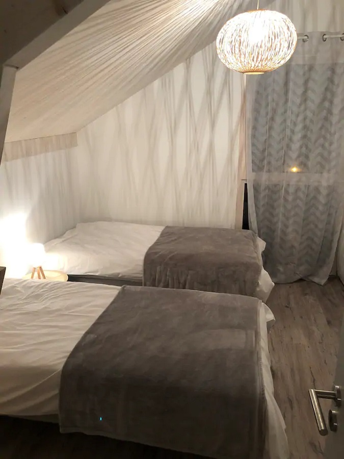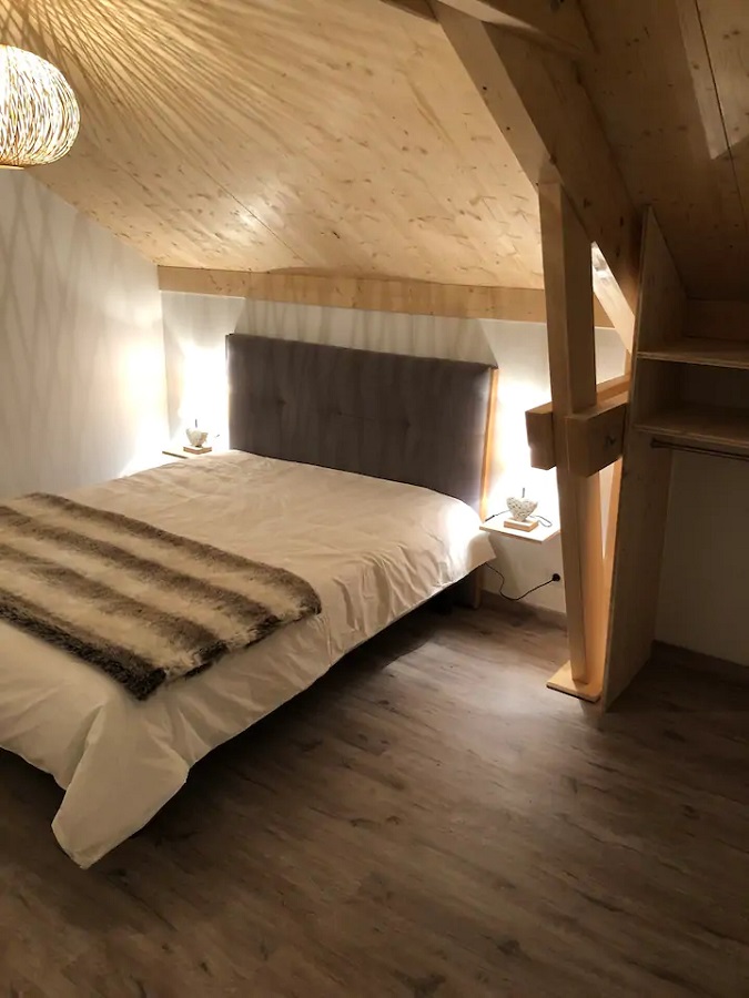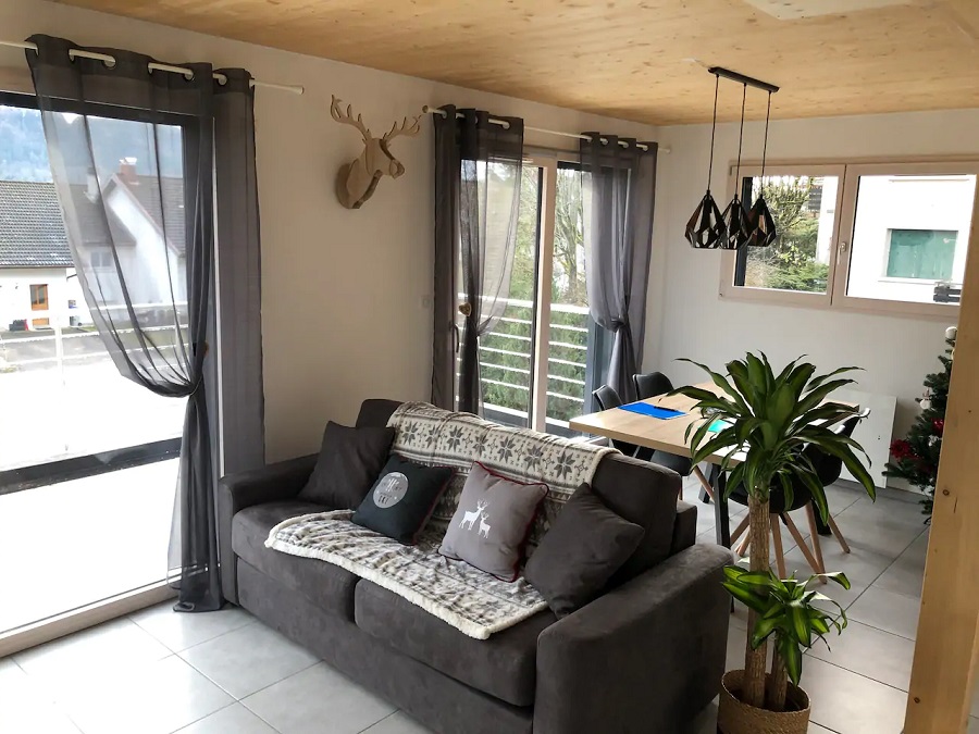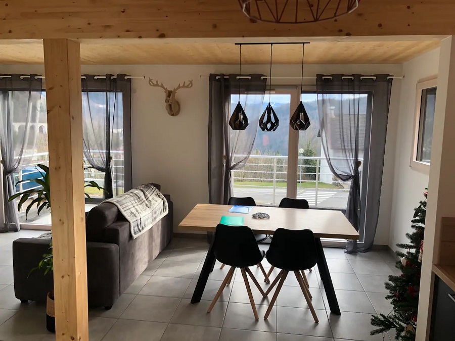 Idéalement située sur les hauteurs de Morbier, cette maison à ossature bois se compose à l'étage d'une pièce à vivre avec cuisine équipée ouverte sur salle à manger et salon (avec canapé convertible pouvant accueillir 2 personnes), WC. Au 2ème étage se trouvent 2 chambres, la première équipée d'un grand lit de 160x200 et la seconde de 2 lits de 90, tous très confortables, parfait pour vous remettre en forme après une journée de ski. Chaque chambre bénéficie de grandes baies vitrées, donnant directement sur le village de Morbier, la vallée de la Bienne et le massif de la Dôle, Le tout dans un décor montagne, mêlant le bois et la modernité, salle d'eau avec douche et WC. Côté extérieur, une terrasse( accessible depuis la salle à manger) avec une vue époustouflante sur le massif montagneux équipée d'un salon de jardin, de chaises longues et d'un barbecue. Les pistes de ski de fond et de descente ne sont qu'à 2 kilomètres : la station des Marais située à Morbier est idéal pour l'apprentissage ou les skieurs débutants, pour les plus chevronnés, la station des Rousses vous propose un grand domaine skiable tant au niveau du fond que du descente. Vous pourrez également découvrir le musée de la lunette à Morez, le centre Paul Emile Victor (musée et patinoire) à Prémanon et partir faire une excursion à la journée en Suisse. Les propriétaires Jean-Charles et Aurélie se feront un plaisir de vous apporter leur conseil sur les sites à visiter, les domaines skiables... Informations complémentaires : sas au RDC pour stocker vos skis, raquettes, vélos... l'accès au gîte se fait ensuite par un escalier d'une quinzaine de marche : vous arrivez dans une pièce avec lave-linge et sèche-linge, vous pourrez également entreposer vos affaires (vêtements, courses, valises...)