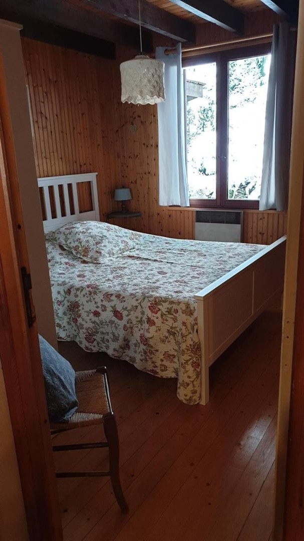 Maison indépendante avec au rez-de-chaussée: ch1: 1 lit 2 pl. Au 1° étage: cuisine, séjour-salon, ch2: 1 lit 2 pl, mezzanine pouvant accueillir 2 couchages enfants avec 2 lits 1 pl, salle d'eau. Cour et jardin privés non clos, salon de jardin, barbecue. Chauffage élec. et bois (bois fourni gratuitement). Charges non comprises. Ce gîte peut accueillir maximum 4 adultes et 2 enfants.