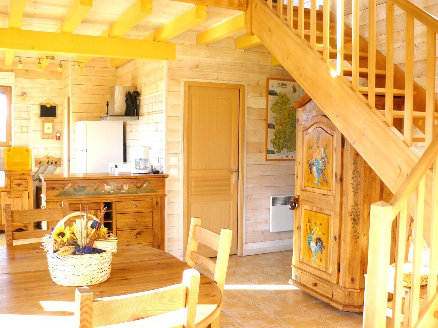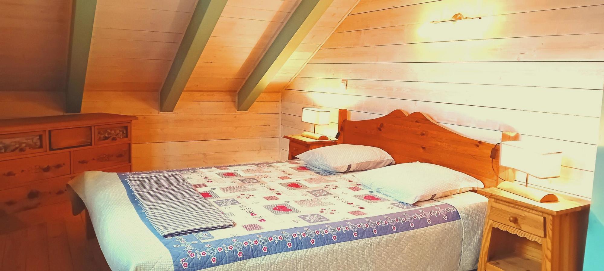 Chalet indépendant, en melèze, construit en 2008 et situé à 300m des plages du Lac de Chalain, dans un quartier très calme. Construction aux normes Haute Qualité Environnementale. Décor montagne, murs et poutres lasurés ou peints, meubles en bois aux décors peints. Grande pièce à vivre de 35 m², 2 chambres de 2 et 3 pers, mezzanine de 27 m² avec salon. Terrasse couverte, balcon, jardin de 1200m², salon de jardin, sauna, cheminée murale, écran plasma. Charges non comprises. Chauffage électrique. Prestation de massage/relaxation au chalet sur demande. Accès wifi Note : un forfait ménage obligatoire s’appliquera automatiquement au moment de la réservation.
