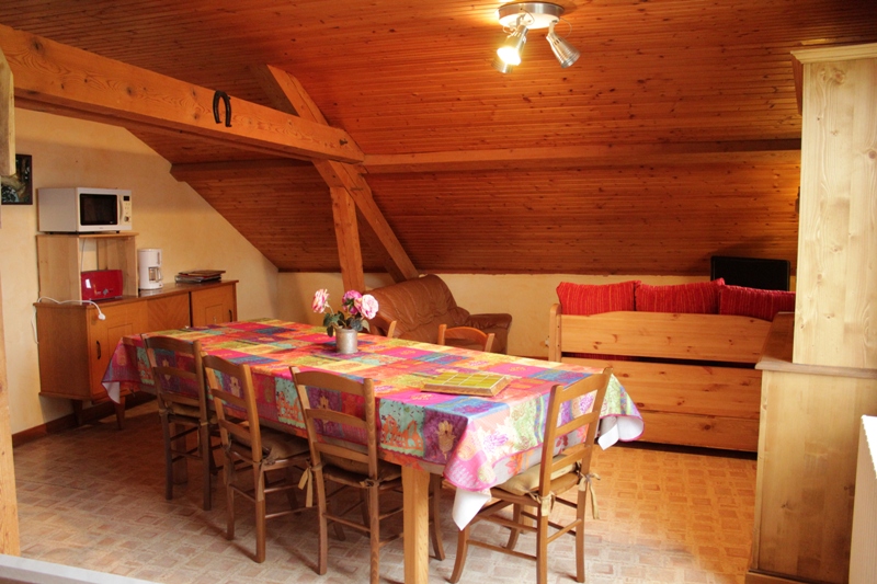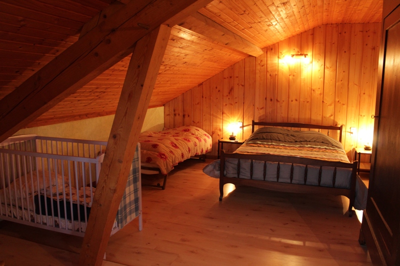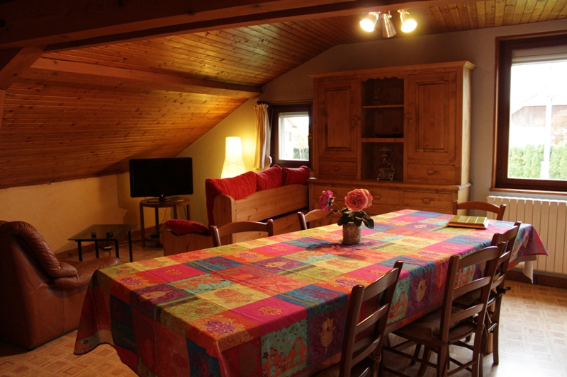 Logement au 2ème étage de la maison des propriétaires avec entrée indépendante. Cuisine-séjour, ch1: 1 lit 2 pl, 1 lit 1 pl, ch2: 1 lit 2 pl, ch3: 1 lit 2 pl, salle d'eau avec douche, WC indépendant à l'étage. Cour et jardin non clos, salon de jardin, barbecue. Chauffage central et électrique. Charges non comprises (consommation moyenne : 20 à 30 € en hiver/semaine). A disposition: lit et chaise bébé, balançoire. Possibilité de rando raquette nocturne ou journée avec le propriétaire (sur demande). Ferme à 150m. terrain de jeux dans le village. Table de ping-pong à disposition. Forfait ménage 100€ pour les sociétés. Parking privé sur place.