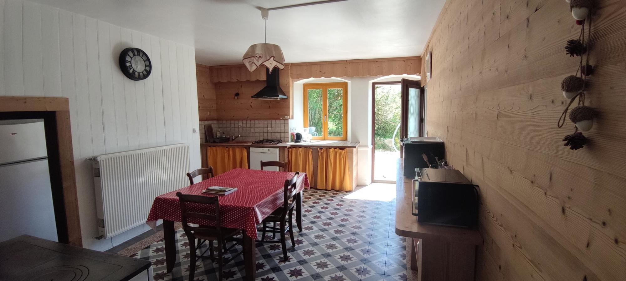 Vous recherchez le charme d'une vieille ferme, du calme pour vous reposer, de l'espace pour les enfants ..et nos amis les animaux, alors vous apprécierez cette ancienne ferme rénovée pouvant accueillir de deux à neuf personnes. Sur un terrain d' un hectare, cette belle maison est le point de départ de vos randonnées avant de vous retrouver pour un bon petit repas devant la cheminée ou un barbecue. Du nord au sud, des vignobles aux stations de ski du haut Jura en passant par la région des lacs et des cascades, chaque visite est une rencontre, un moment inoubliable. Chaque saison offre un décor nouveau, un regard différent sur cette région authentique. Que vous soyez randonneurs, pêcheurs, amoureux de la nature, attirés par la baignade, le VTT ou le ski ou que vous soyez à la recherche d'un patrimoine culturel ou naturel, le Jura vous enchantera. Notre location , de par son implantation géographique, vous garantira un séjour réussi. La petite commune de Saugeot est située au coeur de la région des lacs du Jura, à proximité des Cascades du Hérisson, des lacs et proche des stations de ski du haut Jura. Chèques vacances acceptés. Agencement : Grande cuisine de 20 m² avec cuisinière à bois, plaque cuisson, lave-vaisselle, micro-ondes, mini-four. Séjour de 30 m² avec cheminée et télévision, wifi. Chambre 1 avec un lit 140, un lit de 90, un lit bébé. Chambre 2 avec trois lits de 140. salle de bains avec baignoire, douche et lave-linge, WC indépendant. Appareil à raclette, barbecue, salon de jardin. TARIF pour 6 personnes : 50 euros supplémentaire.