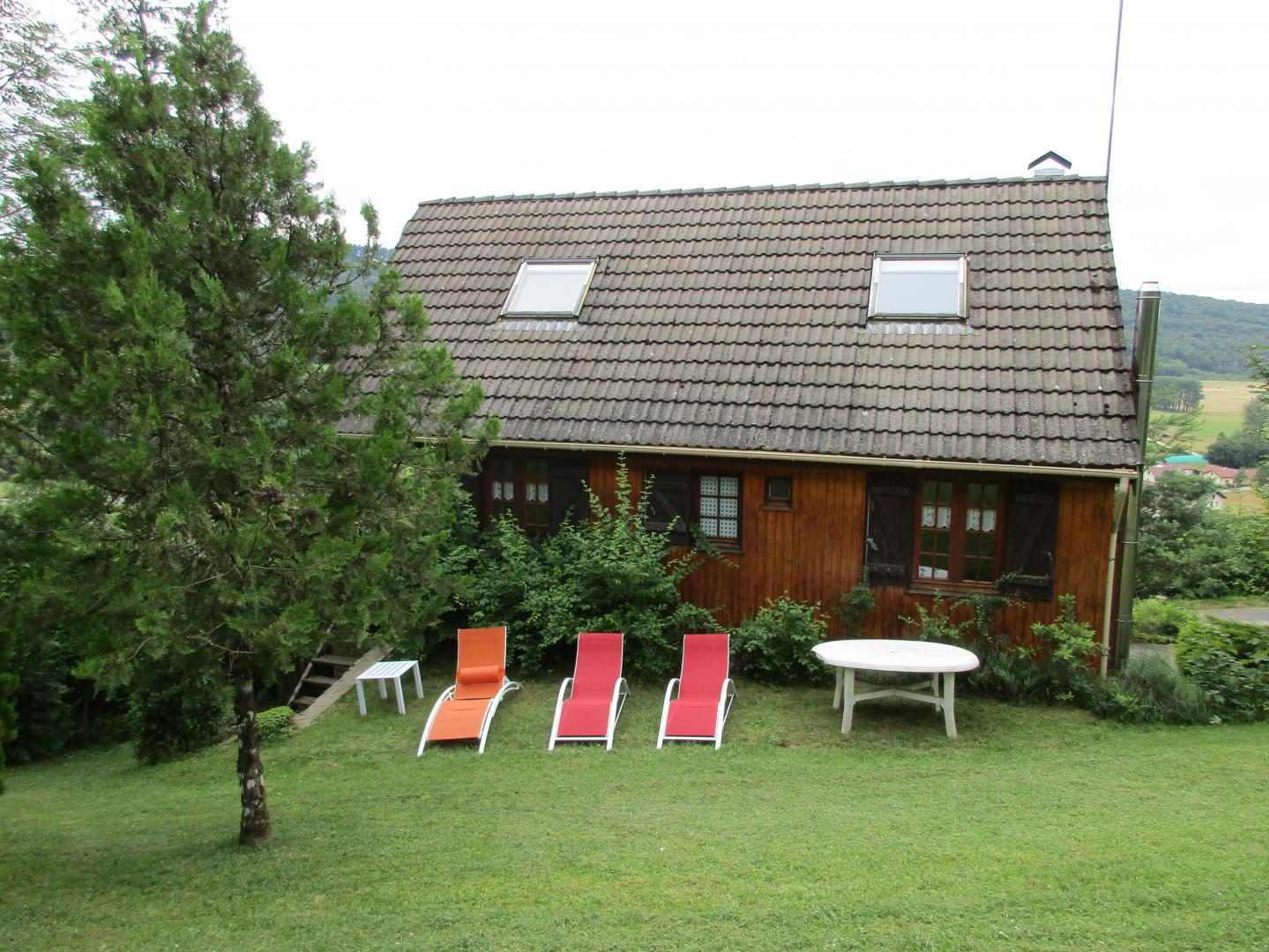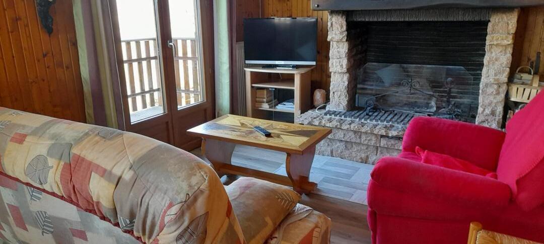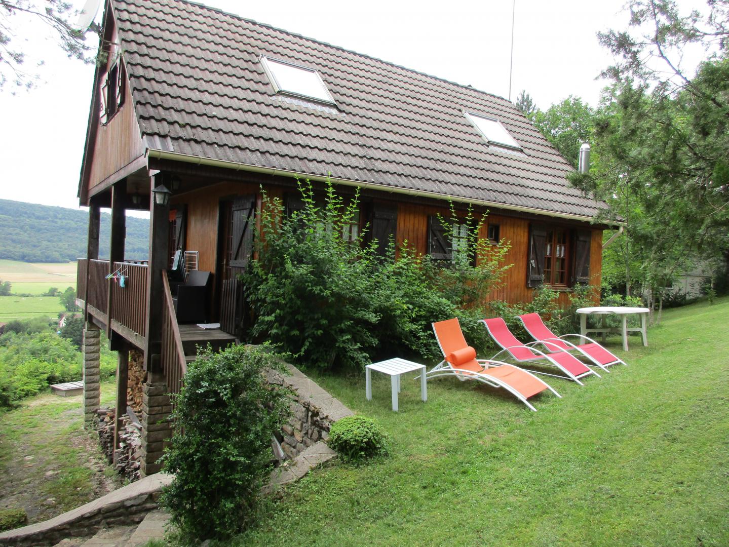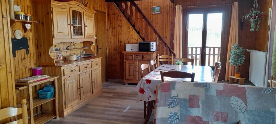 Chalet indépendant. Rez de chaussée garage pour motos et/ou vélos mais pas pour une voiture. A l'étage, coin-cuisine équipée, salon-salle à manger-séjour avec cheminée à foyer ouvert, canapé clic-clac, chambre avec 1 lit 2 place., salle de bain, WC indépendant et en mezzanine ouverte (escalier un peu raide) : 1 lit 2 personnes + 2 lits 1 place. Balcon-terrasse avec belle vue dégagée, terrain attenant clos, salon de jardin, barbecue. Chauffage central. Toutes charges comprises en été. Chauffage hiver : 7€/jour.