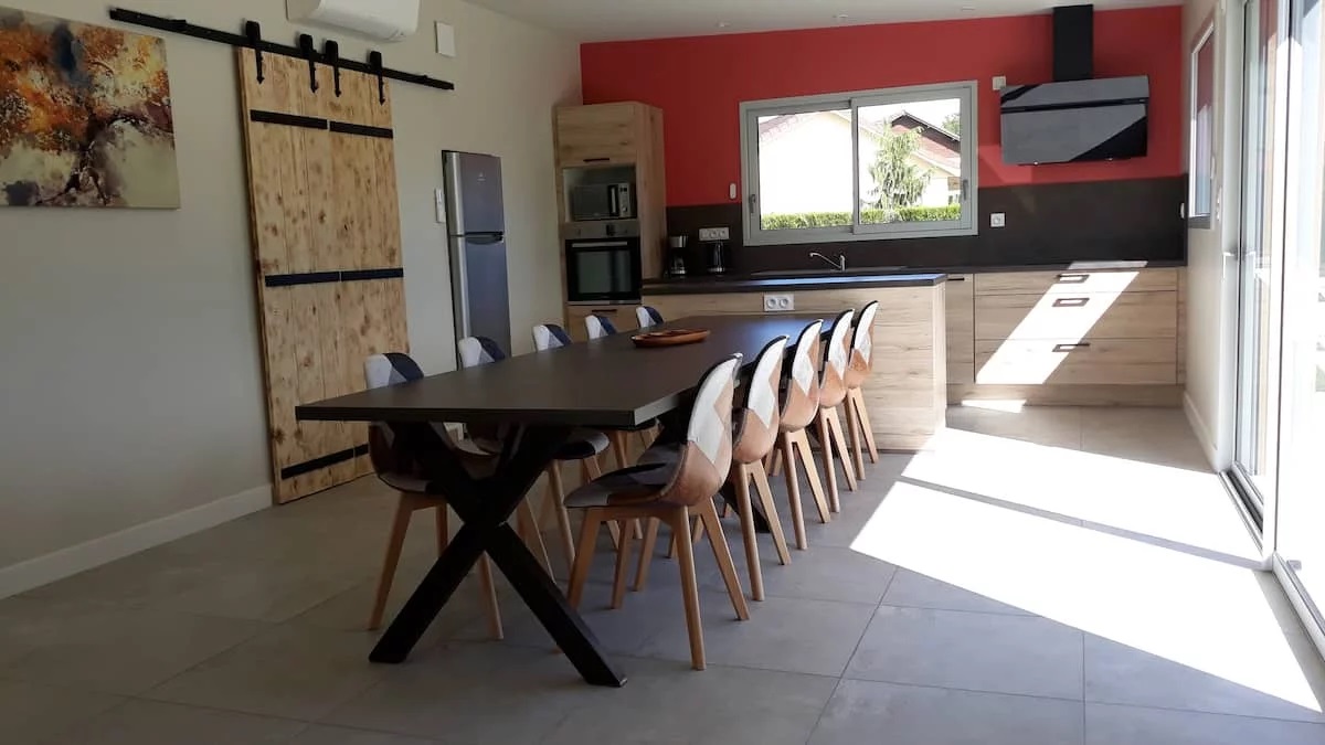 Cette villa entièrement neuve saura vous séduire par ses volumes et ses prestations. Sandra et Jean-Marie ont aménagé l'intérieur avec beaucoup de goût et avec des détails ludiques et pratiques que je vous laisse le soin de découvrir... Elle se compose au RDC d'une grande pièce de vie offrant un accès direct à la terrasse, avec cuisine toute équipée, salon avec TV, d'une chambre accessible PMR avec lit double de 180*200, une chambre avec un lit double de 140*190, d'une salle d'eau accessible PMR avec douche à l'italienne et WC. A l'étage, une chambre avec 2 lits de 90*190, une chambre avec 4 lits simples (dont 2 lits superposés), une salle de bain avec douche à l'italienne et baignoire et un WC indépendant. Pour votre plus grand confort, les lits seront faits à votre arrivée, les serviettes de toilettes sont fournis et le ménage est inclus, il n'y a plus qu'à profiter des vacances ! Côté extérieur, vous pourrez profiter de 2 terrasses couvertes, de transats, d'un barbecue et d'un terrain de pétanque. Un filet de catamaran vous permettra également de vous détendre. Un car-port vous permettra également de stationner 2 voitures. Recharge véhicule électrique possible sur prise renforcée avec sous-compteur, à prix coûtant (câble de raccordement non fourni).
