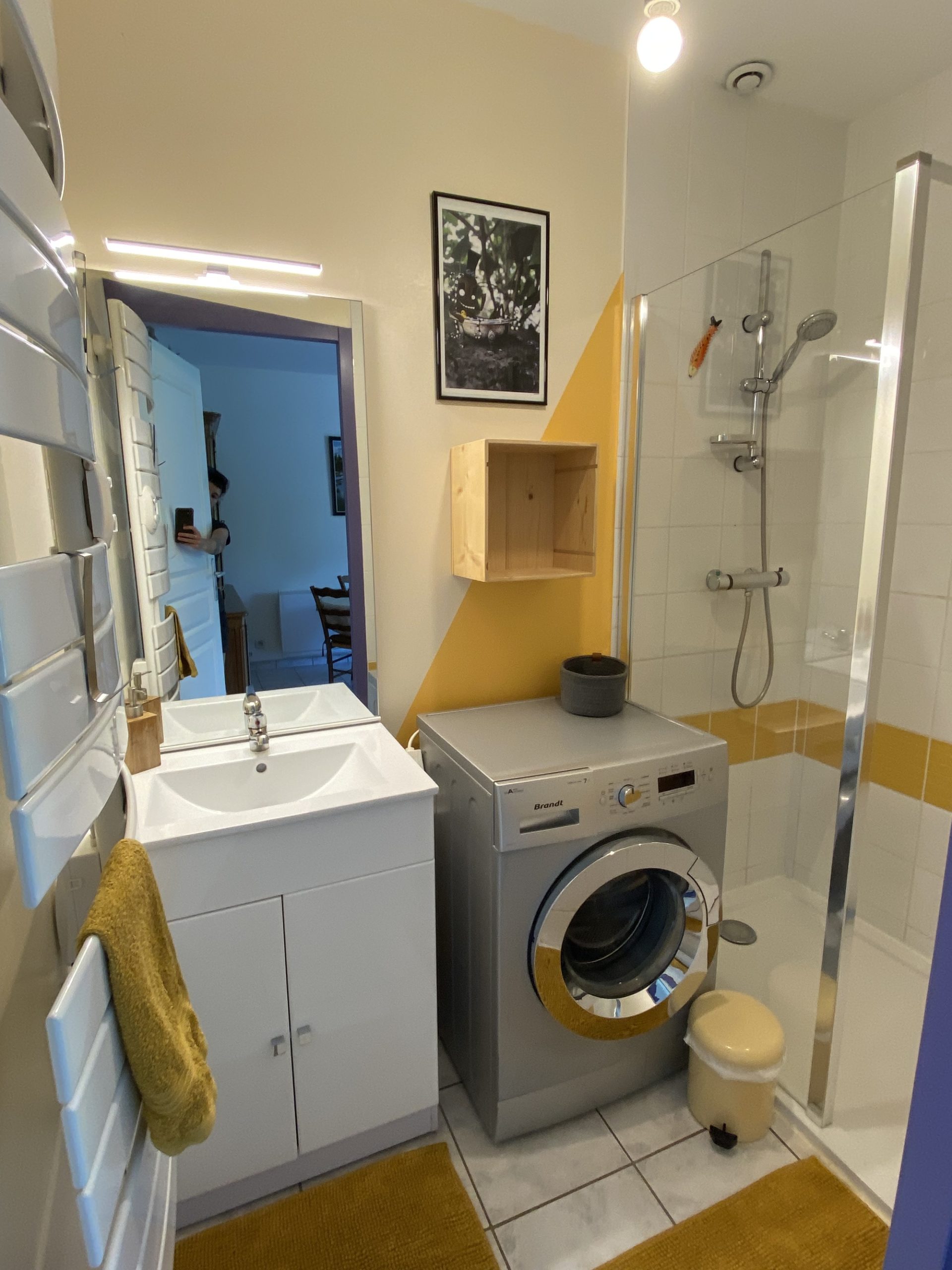 SDB avec douche, sèche serviette, sèche cheveux. toilettes séparés.