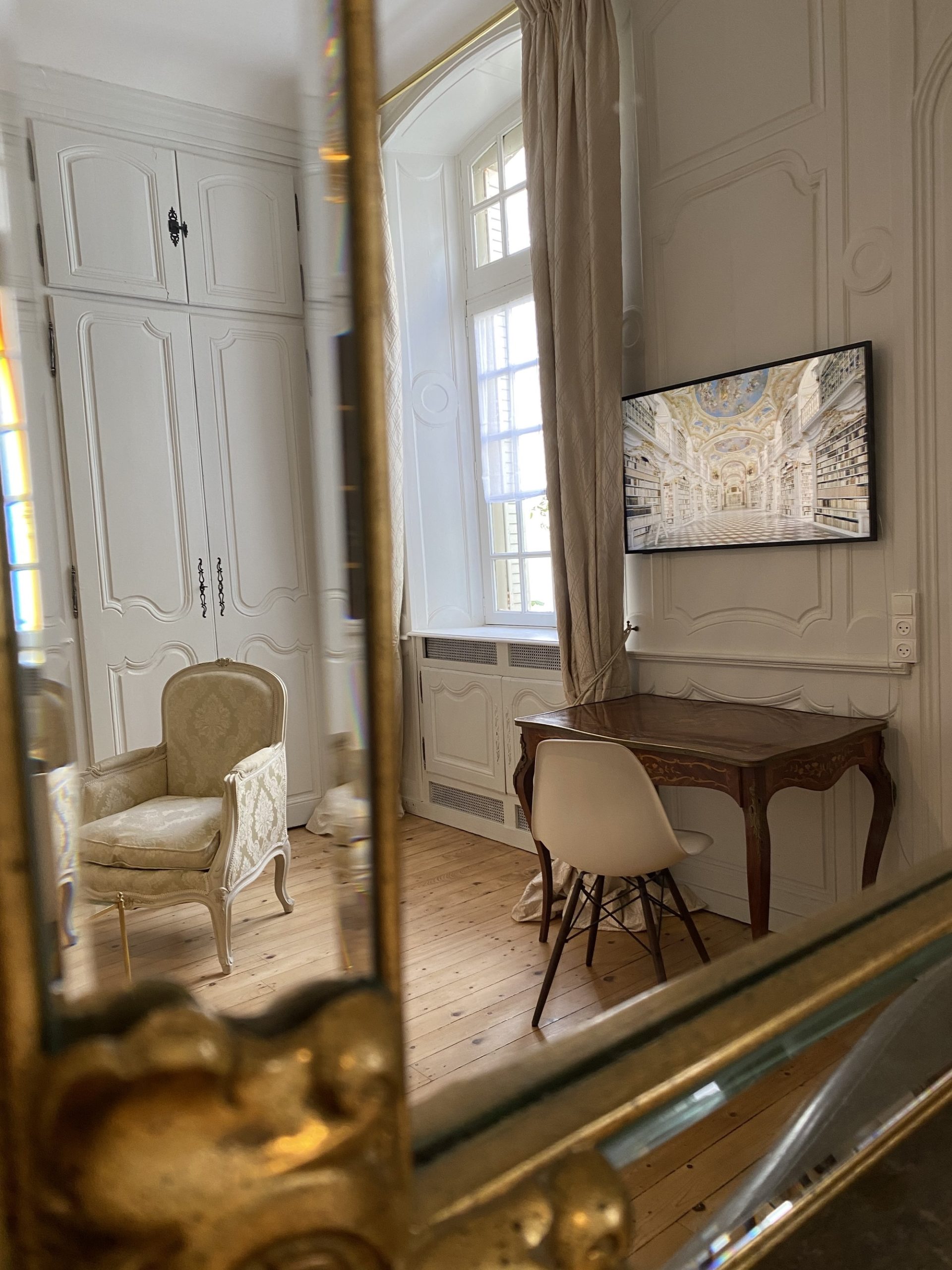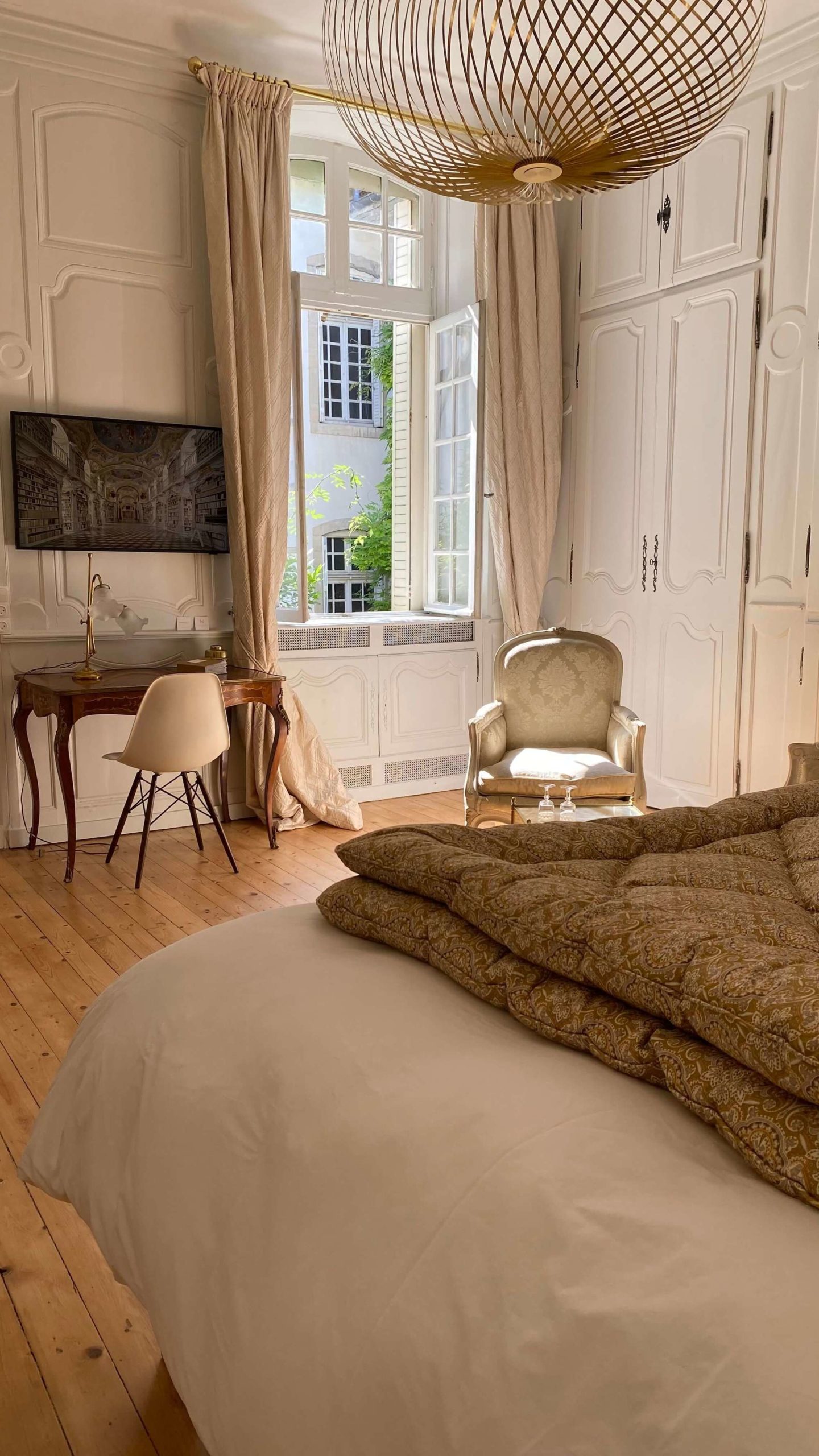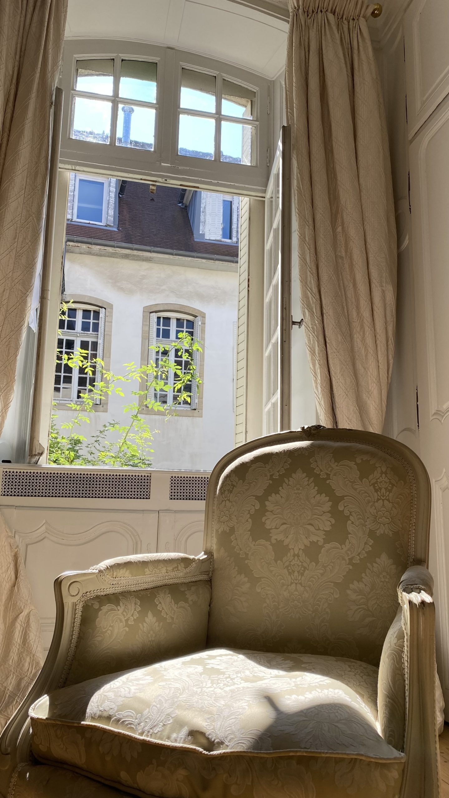 Chambre d'hôtes à Lons le Saunier dans un cadre architectural d'exception, et dans un coeur de ville charmant et chargé d'histoire. Effervescente les mois d'été, la piétonne rue Perrin se transforme pour redevenir plus silencieuse, la saison passée. Restaurants, terrasses multiples, librairie, cinéma, artisanat...embarras du choix ! Ouvrez la porte et découvrez une autre réalité, celle d'un hôtel particulier du XVIIIème siècle. Vous expérimentez une autre façon de voyager. C'est dans ce cadre que vous séjournerez , au coeur d'un appartement rénové et décoré par Merveilles de Marie où antiquités et design se côtoient pour vous émerveiller. Chambre sur cour végétalisée, calme et sérénité, literie hôtelière, haut de gamme, King size 180 et séparable en 2X90 pour un repos incomparable. Les oiseaux au petit matin, un rayon de soleil pour arriver jusqu'à la salle à manger où un petit déjeuner vous sera servi. Nous vous proposons, dans ce cadre d'exception, un service exclusif, vous êtes les uniques hôtes de ces lieux. Le voyage commence maintenant.