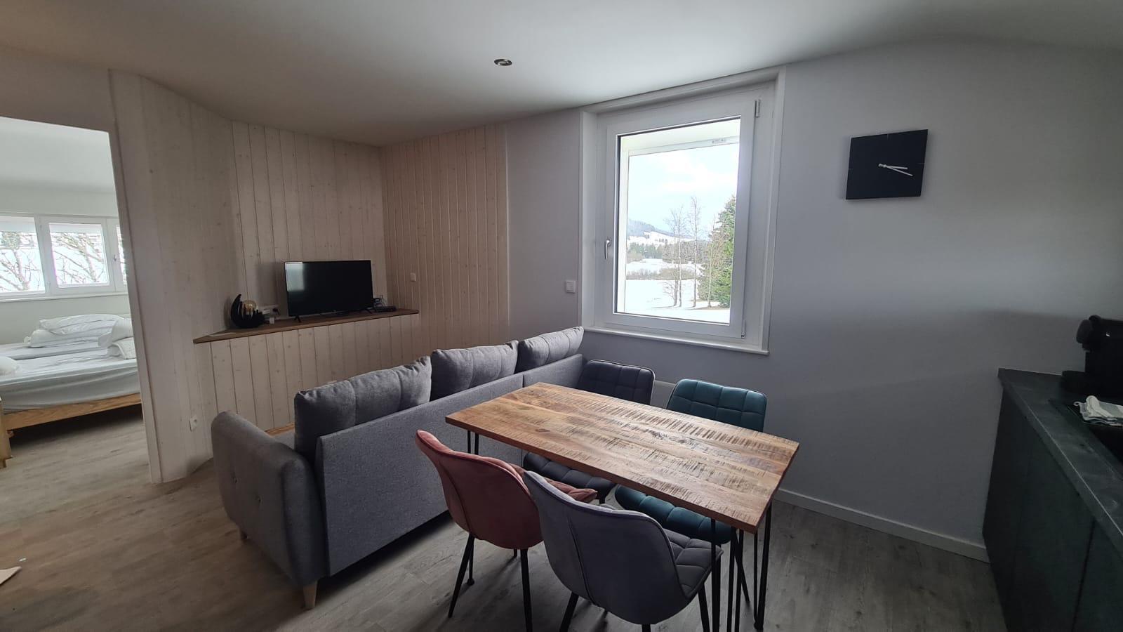 Logement à l'étage de la maison du propriétaire. Cuisine-séjour, salle d'eau, wc séparé, ch1: 1 lit 2 pl 160X200cm, ch2: 2 lits 1 pl, cour, terrain attenant non clos calme, plein sud, vue imprenable, barbecue, salon de jardin, portique- balançoire, trapèze et corde, local pour skis et vélos. Parking privé. Chauffage électrique. Garage. Toutes charges comprises.
