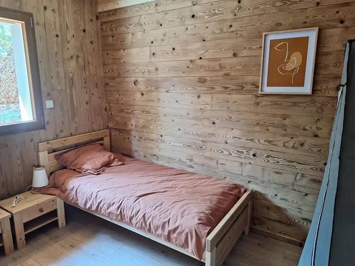 Cette maison neuve à ossature bois, de plain-pied, située à proximité du Pays des Lacs se compose d'une pièce de vie avec cuisine toute équipée, d'un coin salon avec TV, d'une chambre avec un lit double (160*200), d'une chambre avec 2 lits simples (90*200), d'un WC indépendant et d'une salle d'eau avec douche. Côté extérieur, vous pourrez profiter des beaux jours sur la terrasse, équipée avec salon de jardin, transats et barbecue. Note : Au moment du départ, le chalet doit être propre et rangé, le lave vaisselle doit être vidé, la vaisselle rangée, le gite doit impérativement être balayé avant le départ et le nettoyage du coin cuisine est impératif avec ou sans forfait ménage. Une caution de 30 euros pour le nettoyage du coin cuisine vous sera demandée. ATTENTION : les prises de courant ne sont pas aux normes pour la charge des véhicules électriques. Il est formellement interdit de s'en servir pour une telle utilisation. Risque de court circuit ou d'incendie. Une borne de recharge rapide est disponible à 200 m (nous contacter) Un autre gite est situé à côté de celui ci pour 4 personnes également. ils peuvent être réservable en commun. Parking privé sur place et volets dans les chambres.
