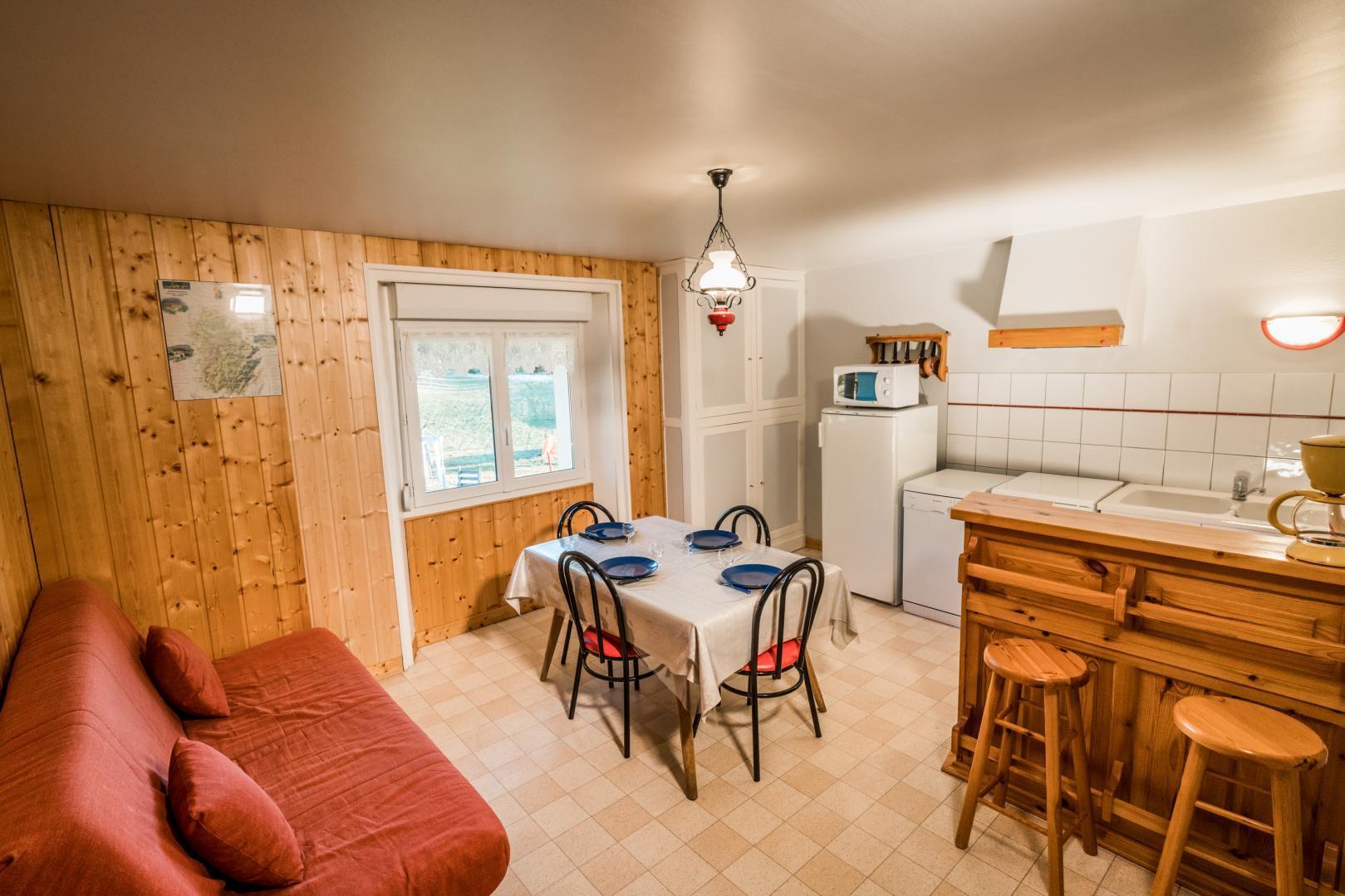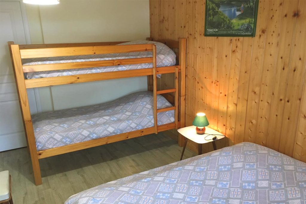 Logement à l'étage d'une maison où se trouvent d'autres appartements. Séjour-coin cuisine, canapé convertible, tv avec TNT. ch1: 1 lit 2 pl, 2 lits superposés (possibilité d'accueillir une personne supplémentaire sur demande auprès des propriétaires), salle d'eau, wc indépendants, terrain attenant commun non clos, salon de jardin, barbecue, aire de jeux (balançoire, bac à sable, tennis de table), lit et chaise bébé à disposition. Piscine intérieure chauffée et accessible toute l'année. Chauffage central.Toutes charges comprises. Lits équipés de couettes. Lave linge commun. Connexion wifi gratuite.