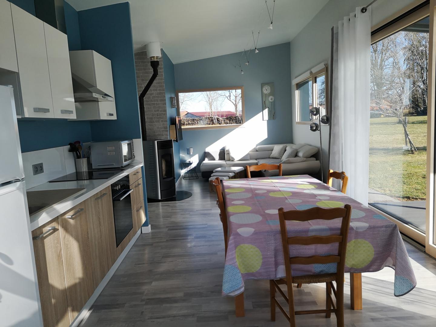 A seulement quelques kilomètres de la petite cité médiévale de Nozeroy, idéalement située entre lacs et montagnes afin de ravir les amateurs de randonnées, de baignade ou de ski, venez découvrir cette jolie maison indépendante de plain-pieds, et profiter du calme environnant. Pièce à vivre très lumineuse, composée d'une cuisine entièrement équipée, et d'un salon avec une télévision incurvée et un poêle à granulés. Une chambre avec un lit de 140cm et la seconde avec 2 lits de 90cm. Salle d'eau avec une vaste douche à l'italienne et WC. Terrasse équipée d'un salon jardin, barbecue et transats. Grand terrain attenant non clos avec balançoires, toboggan, trampoline et table de ping-pong. Parking privé sur place. Local pour entreposer matériel encombrant (ski, vélo, coffre de toit...). Possibilité d'abri voiture en cas de neige ou grêle. Baignade autorisée du mois de mai à fin septembre dans la piscine des propriétaires, couverte et chauffée par panneaux solaires. Équipement bébé à disposition sur demande. Parking privé sur place, volets dans les chambres