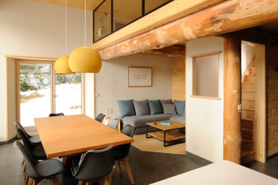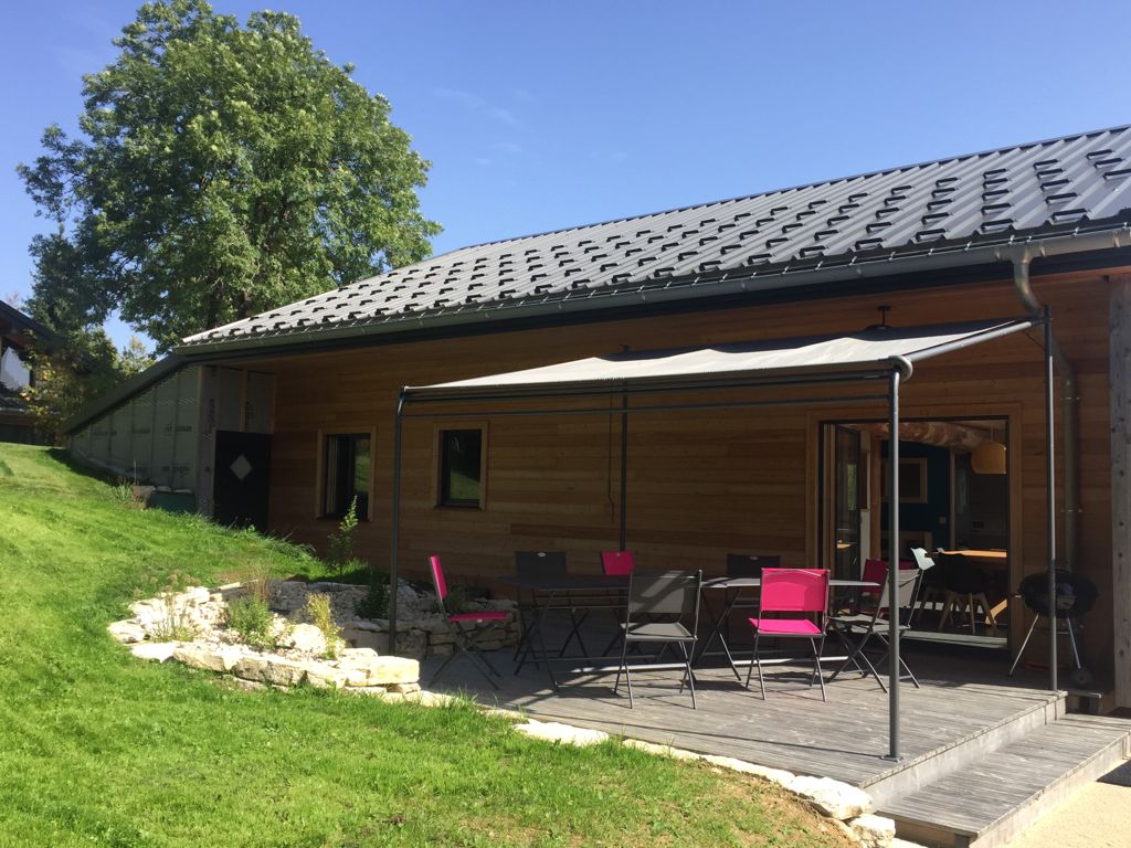 Bienvenue dans ce gîte auto-construit, passif et respectueux de l'environnement (isolation en bottes de pailles, chauffage solaire, peinture sans solvant, compost) qui vous séduira par sa vue sur la forêt environnante. Il se compose au rez-de-chaussée d'un hall d'entrée où vous pourrez entreposer skis et chaussures, d'une pièce de vie lumineuse avec coin salon équipé d'une TV écran plat, d'une cuisine moderne avec équipements haut de gamme, de 2 chambres en duplex avec 2 lits simples et 1 lit en 140 en duplex (attention escalier étroit pour monter et espace nuit restreint), d'un WC indépendant et d'une salle d'eau avec 2 cabines de douches. A l'étage vaste mezzanine avec coin enfants : (jeux, livres , puzzle), espace détente (filets de catamaran suspendu) et baby-foot, 1 chambre avec 1 lit en 140. Pour votre plus grand confort, les lits sont faits à votre arrivée et les linges de toilette sont fournis. Côté extérieur, salon de jardin, transats, barbecue et terrain de pétanque vous permettront de passer d'agréables moments en famille ou entre amis. Parking privé avec un à deux emplacements couverts. Possibilité de garage à vélo fermé. Note : des toilettes sèches se trouvent également à l'extérieur (isolées et chauffées)