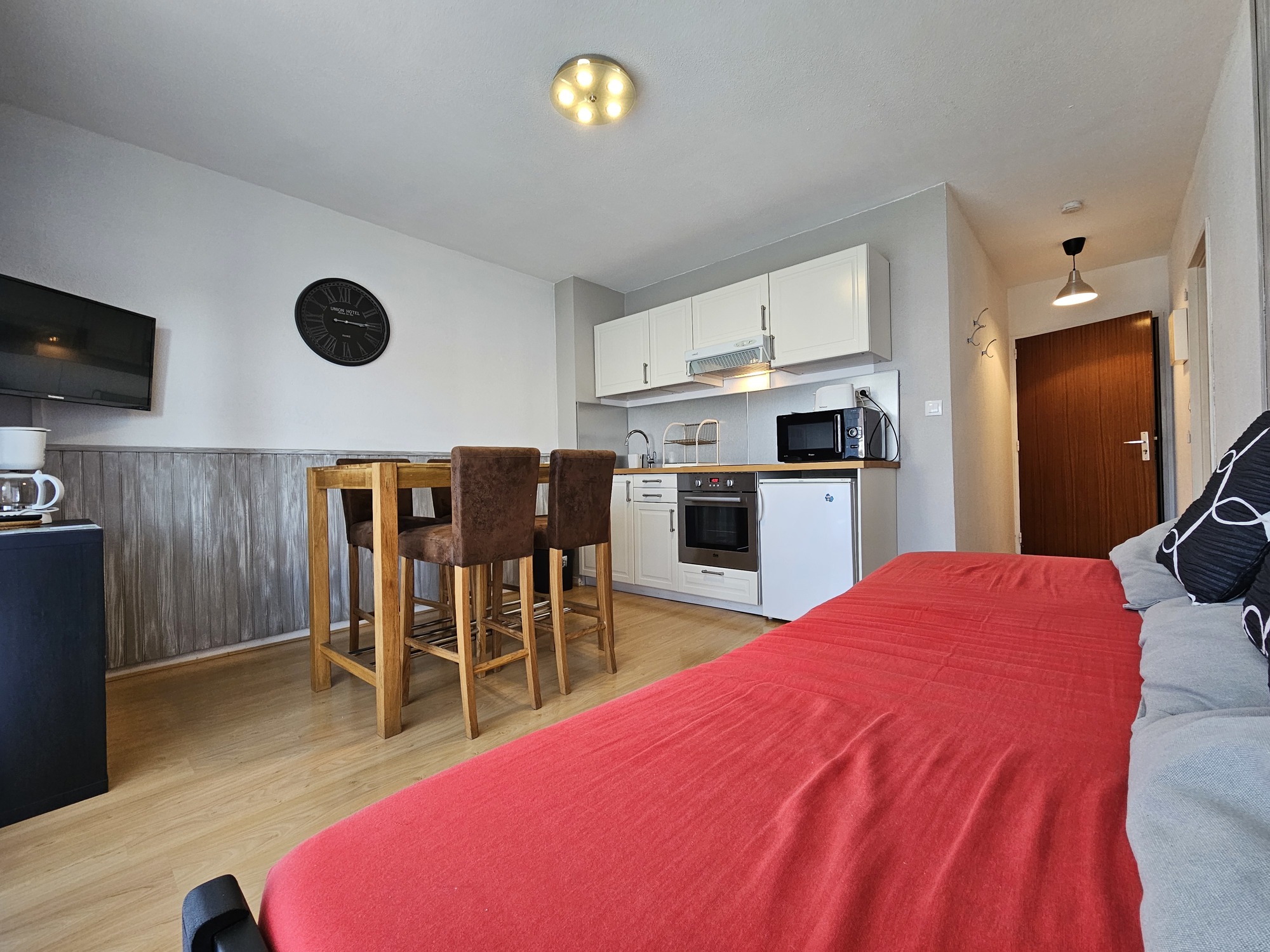 Situé dans la résidence "Le Plein Soleil", cet appartement de 35m² au 1er étage est composé d’une pièce principale avec coin cuisine/repas et canapé lit transformable en deux lits de 80cm ou en lit de 160cm. Une chambre indépendante avec lit de 160cm. Salle de bain et WC indépendant. Un accès extérieur sur balcon complète le tout. Place de stationnement privée dans le parking souterrain. Résidence avec piscine intérieure.