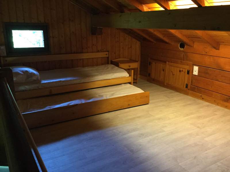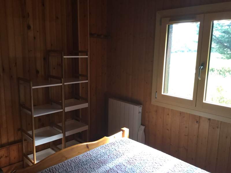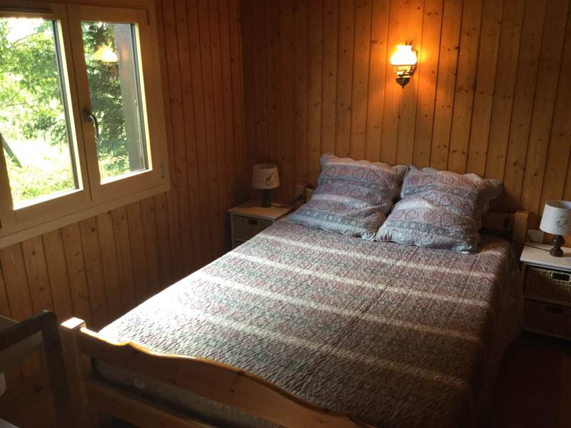 Chalet bois pour 2 à 4 personnes situé dans un village calme. Hall d'entrée, espace cuisine toute équipée, salle à manger (poele à bois) et coin salon avec canapé convertible (couchages possibles : literie rapido), salle d'eau (douche et wc), mezzanine 2 couchages en lit gigogne (80x190). Une chambre avec 1 lit en 140x190. Le gîte est de plain pied sauf la mezzanine (escalier raide). La cuisine et la chambre sont accessibles par 3 marches. Terrain attenant non clos en pleine nature avec une belle vue sur la campagne. Salon de jardin et barbecue.