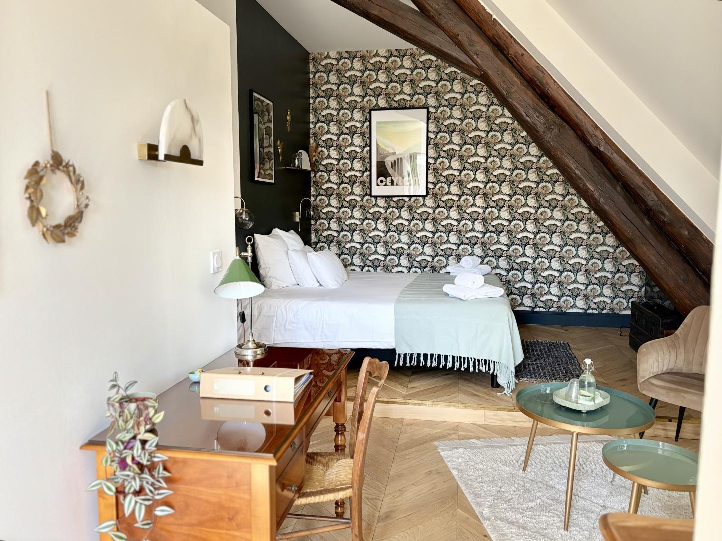 Ancien fief d'une sergenterie des Templiers, cette maison est une bâtisse chargée d'histoire. Rénovée en conservant son caractère et en y ajoutant de la modernité pour vous offrir le meilleur confort durant votre séjour, Nell et Clément, les propriétaires ont mis tout leur cœur et leur énergie dans la restauration de cette maison pour vous offrir une escapade unique, dans un lieu chaleureux et douillet. 3 chambres sont situées au 2ème et dernier étage de la maison : La Mont Roland se compose de 2 lits de 100*100 (ou lit king-size de 200*200) avec baignoire rétro, douche à l'italienne et WC indépendant La Mont Joly avec sa teinte terracotta est équipée d'un lit king-size 180*200, d'une spacieuse douche et d'un WC indépendant La Mont Plumont vous propose 1 chambre avec lit king-size de 180*200, une salle avec douche, un WC indépendant et un espace nuit sous les combles avec 2 lits simples et 1 WC (pièce mansardée, peut convenir à des adultes mais il est possible qu'il faille se baisser un peu à certains endroits. L'escalier pour accéder à la mezzanine est un peu raide et peut ne pas convenir à des enfants trop jeunes.) Et les deux petites dernières : la Cuisance et la Loue, situées dans une annexe de la bâtisse principale et chacune avec 1 lit king size 180*200, une TV, une salle d'eau avec douche et WC indépendant Les serviettes, peignoirs et chaussons sont fournis. Vous prendrez vos petits-déjeuner dans une magnifique salle voûtée où les produits bio et locaux sont privilégiés : boissons chaudes, jus de fruit, viennoiserie, fromage, charcuterie, œufs.... Vous pourrez profitez en toute quiétude d'une terrasse aménagée et ombragée, flânez dans le parc arboré pour aller à la rencontre des animaux (ânesses, chèvres, canards, poules), jouez aux boules et vous rafraîchir dans la piscine (14*3 avec 1.55 de profondeur). Sur réservation : plateau repas et petite restauration - possibilité de privatiser les chambres et l'espace extérieur