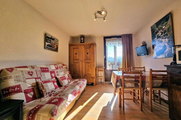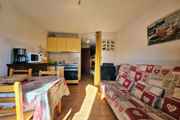 Situé dans la résidence "Les Crêtets", ce studio de 24m² au 2ème étage est composé d’une entrée avec lits superposés de 90cm ainsi que d’une pièce principale avec coin cuisine/repas et canapé lit clic-clac. Un coin nuit fermé par un rideau avec lit de 140cm. Salle de bain et WC indépendant. Parking privé à la résidence.