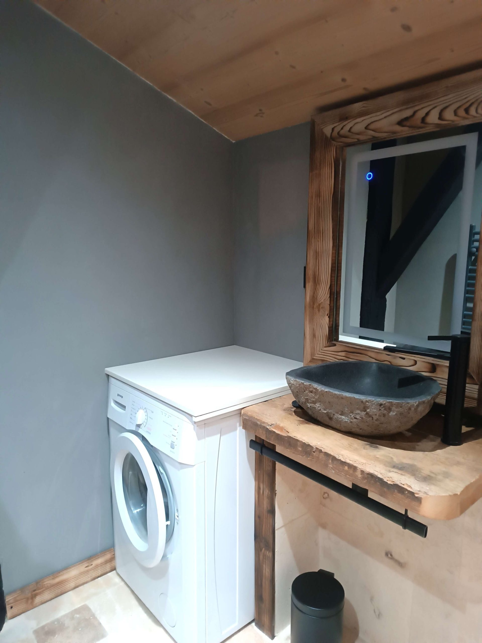 1 salle de bain avec 1 douche, 1 WC, 1 machine à laver, 1 lavabo