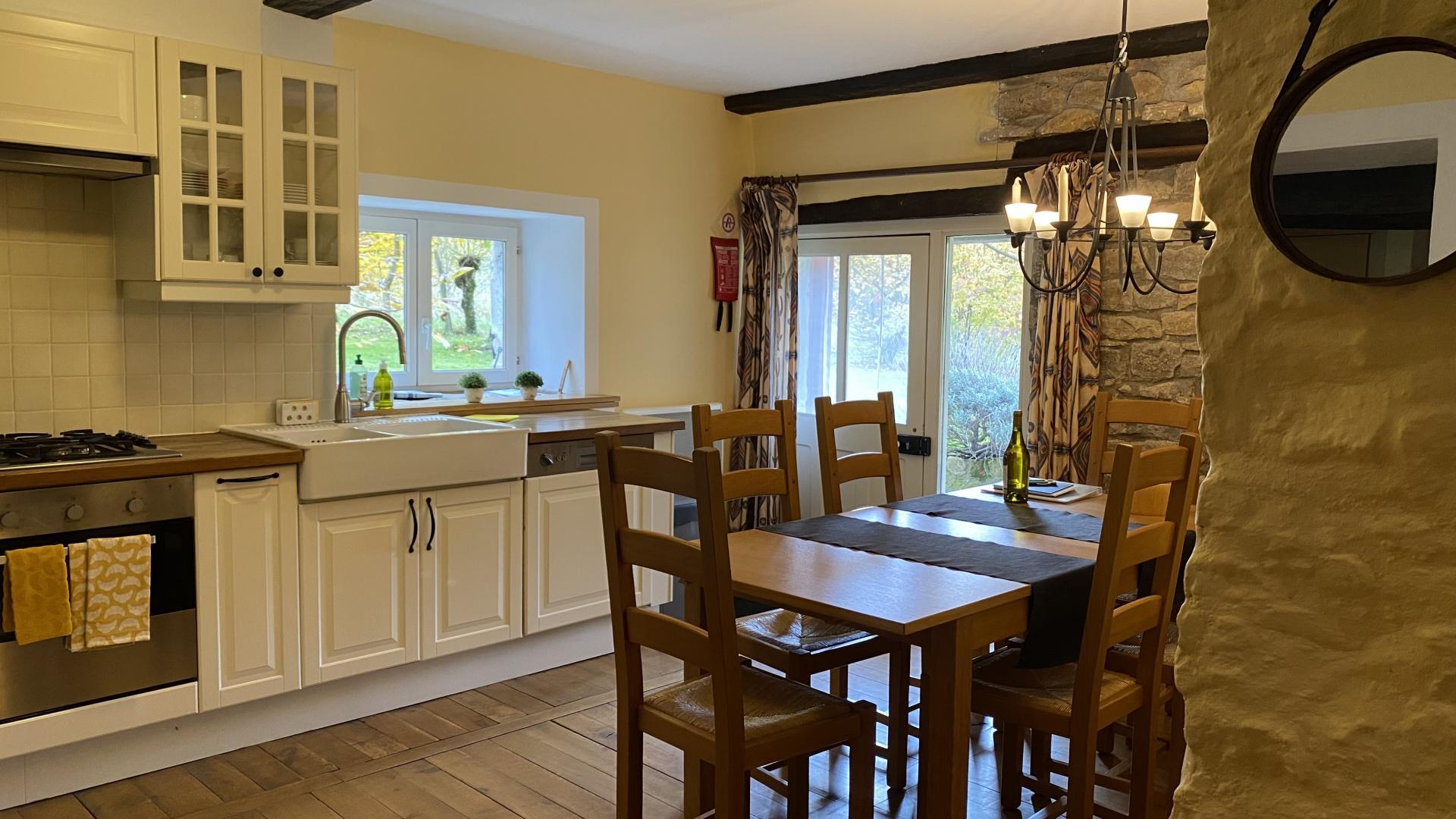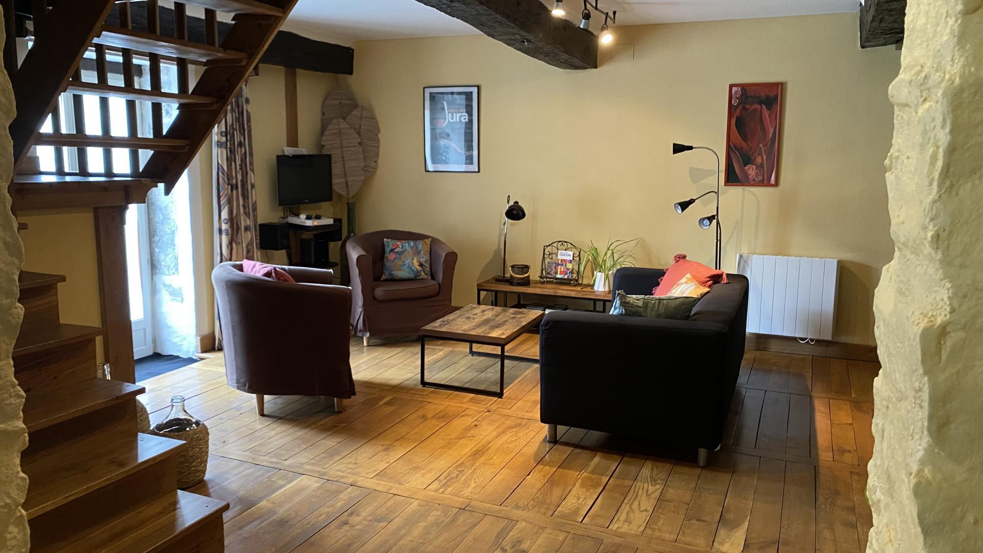 Belle maison mitoyenne en pierre sans vis à vis, (gite de l'autre côté de la maison des propriétaires), entièrement rénovée, située dans un joli petit village, au coeur du vignoble jurassien. Au RDC: cuisine, séjour-salon avec cheminée électrique, lecteur DVD, internet. Lave linge et sèche linge, WC indépendant. A l'étage, CH1: 2 lits 1 pl accolés avec salle de bains privée et WC, CH2: 2 lits 1 pl accolés + 1 lit 1 pl en mezzanine avec salle de bains privée et WC. Terrasse, jardin, terrain attenant non clos, salon de jardin et barbecue en été. Location de VTT/VTC sur place. Gîte non fumeur. Possibilité court séjour à partir de 72€/nuit avec min de 250€. Supplément 6ème personne : 20€ (inclus draps et linge et lit supplémentaire)