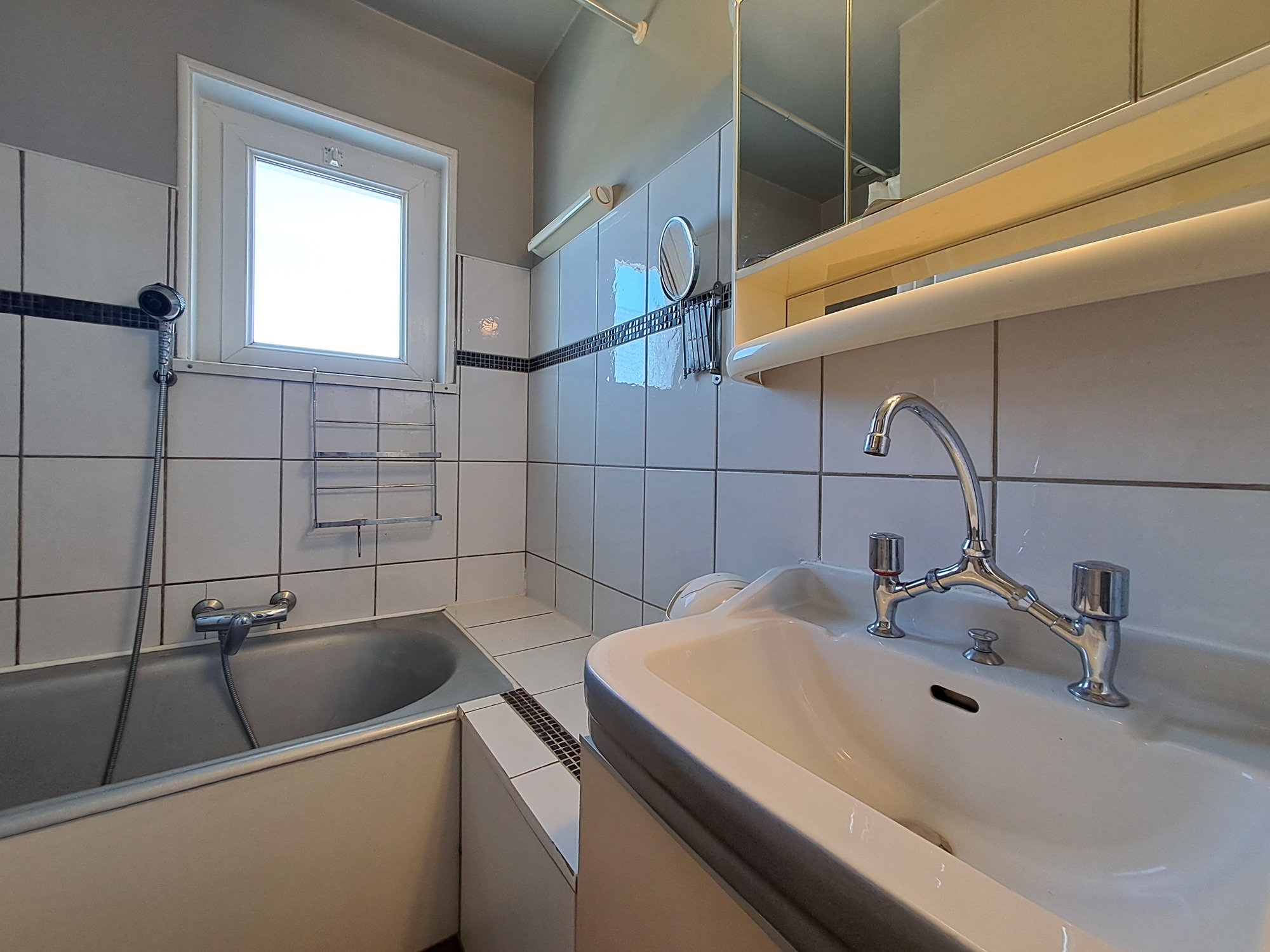 Terrain attenant avec salon de jardin et barbecue l'été.