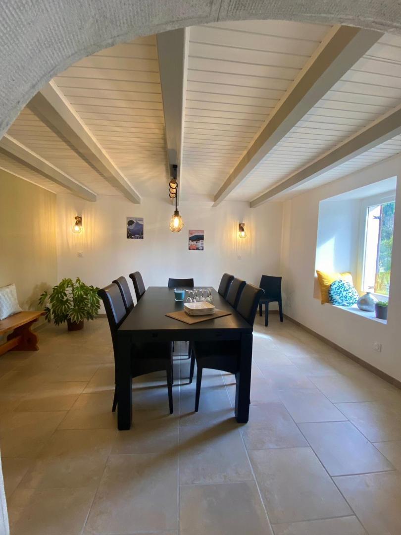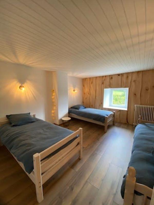 Cette maison mitoyenne située dans une impasse, au calme, se compose au rez-de-chaussée : d'une pièce de vie avec cuisine toute équipée (qui offre un accès direct à la terrasse) et salle à manger, d'un coin salon avec TV et d'un WC. A l'étage, une chambre avec un lit double (160*200) et douche privative, une chambre avec 1 lit double (160*200) et une troisième chambre avec 3 lits simples (90*190), une salle d'eau avec douche, un WC indépendant. Côté extérieur, vous pourrez profiter de la terrasse aménagée avec salon de jardin ,transats et barbecue. Idéalement situé, vous pourrez rejoindre la plage de la Mercantine (lac de Vouglans) et le lac Genin en une vingtaine de minutes, découvrir la ville de St Claude réputée pour la pipe et le diamant, c'est également le point de départ du circuit ferroviaire de la ligne des hirondelles, qui vous fera découvrir des paysages époustouflants en rejoignant Dole. Les Hautes-Combes, pour les amateurs de randonnées, de ski de fond, ou tout simplement pour contempler les immenses combes et forêt d'épicéas se situent à une quinzaine de minutes. Note : dimension des couettes pour lit 160*200 : 260*240