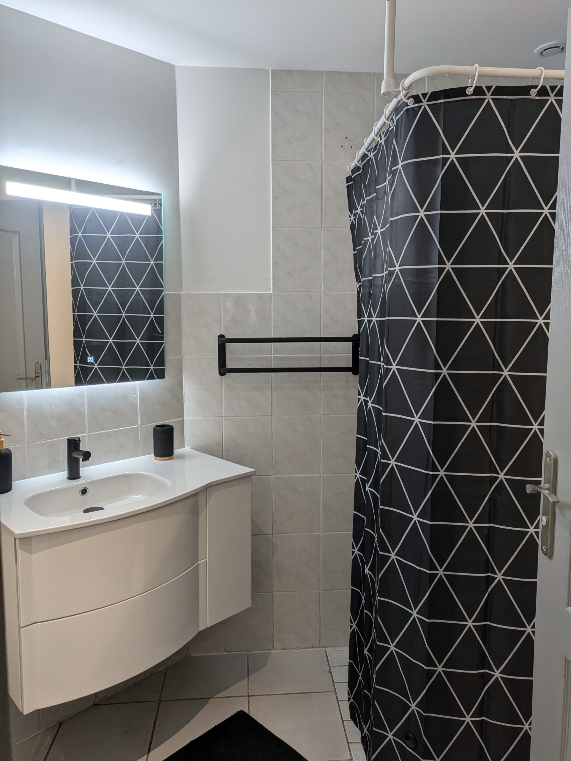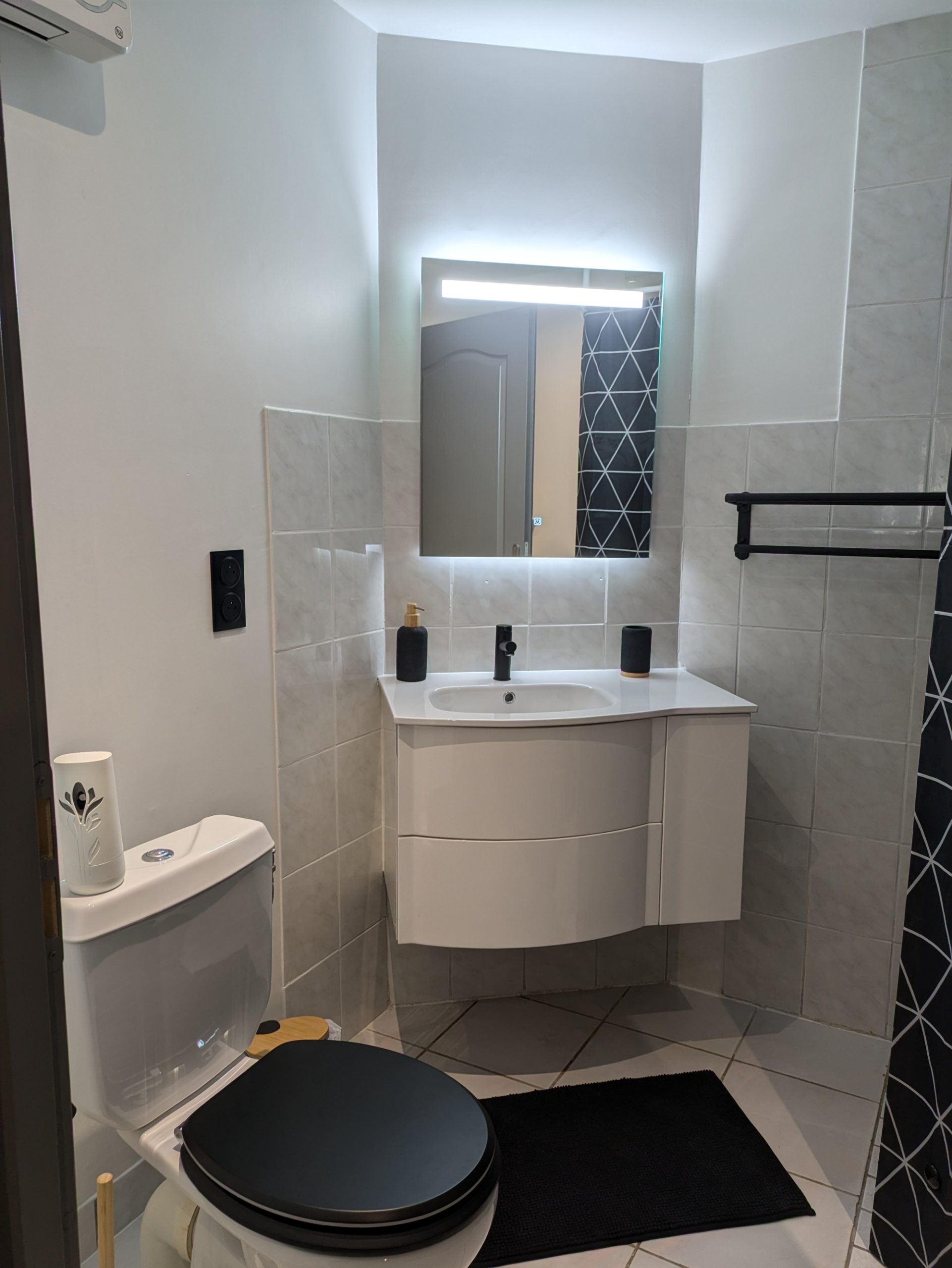 Une salle de bain avec douche a l'italienne et un meuble vasque, machine à laver et un WC .
