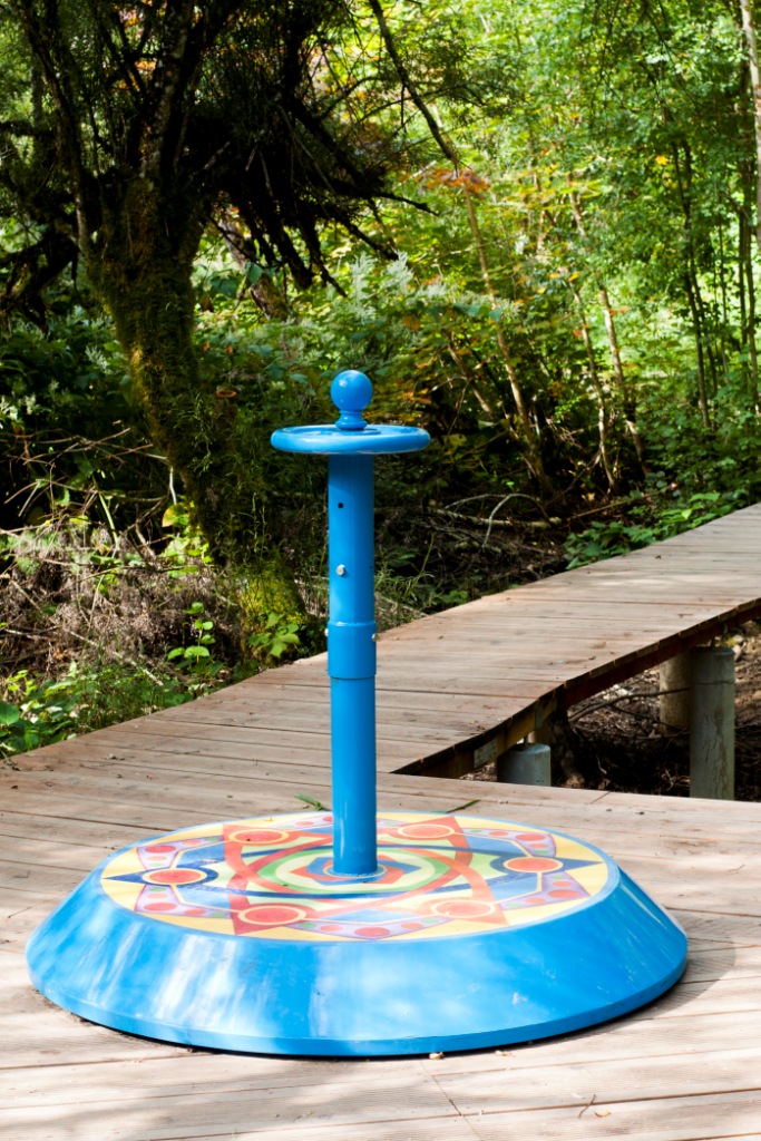 Le chemin passe sous la robe et se poursuit dans le bois. Continuer dans ce petit bois de main en main pour trouver les Sièges en bois.