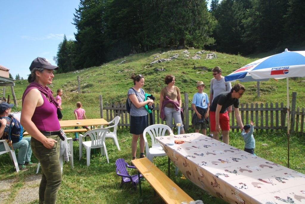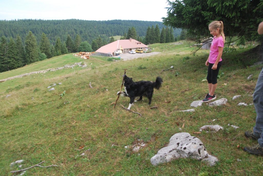 Pendant que Mafalda cherche les sauterelles, nous marchons sans le savoir sur les pistes de ski de La Vattay et passons la frontière : un bloc de pierre signifie le passage de France en Suisse. De là, nous admirons le sommet de la Dôle à 1677 m. Il est temps de redescendre au chalet d’alpage de La Germine où Inouk, le chien de Samuel, nous accueille avec gaieté.